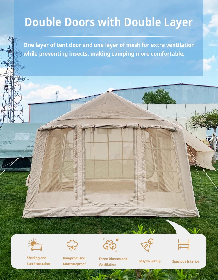 Nombre Tienda de campana inflable Tamaño 400*300*200 cm Tela Lona de algodón de 300 g/m2, revestimiento de PU Hoja de tierra PVC ripstop de 540 g/m2, resistente al agua Bomba manual 1 pieza Tubería inflable 13 cm de diámetro Tamaño del paquete 82*45*45cm Peso 24 KG