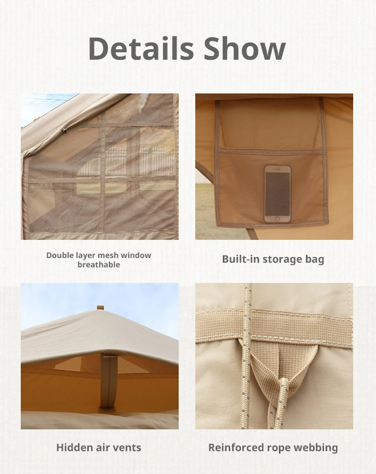 Nombre Tienda de campana inflable Tamaño 400*300*200 cm Tela Lona de algodón de 300 g/m2, revestimiento de PU Hoja de tierra PVC ripstop de 540 g/m2, resistente al agua Bomba manual 1 pieza Tubería inflable 13 cm de diámetro Tamaño del paquete 82*45*45cm Peso 24 KG