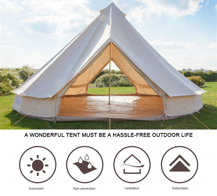 Nombre del artículo Tienda de campana Diámetro 3m,4m,5m,6m,7m Tela de techo Lona de algodón de 300 g/m2 Característica Revestimiento de PU, resistente al agua, resistente al moho. Cremallera Cremallera SBS MOQ 1 pieza Logotipo Logotipo personalizado La garantía 12 meses