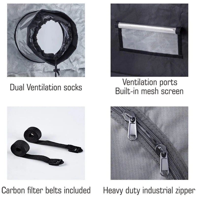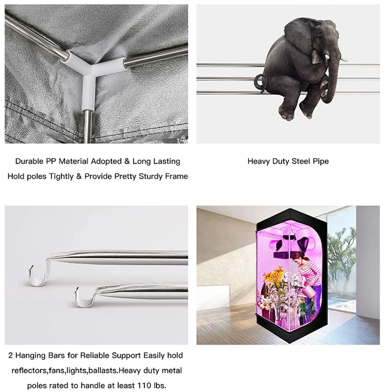 • Robusto: El marco y todos los soportes de esquina están hechos de acero tubular recubierto de polvo, de alta calidad y alta capacidad; no se agrietará como tubos/accesorios de plástico y no se colapsará ni se hundirá como el aluminio. Los rieles superiores extraíbles proporcionan un soporte superior para los sistemas de iluminación, control de olores y ventilación.