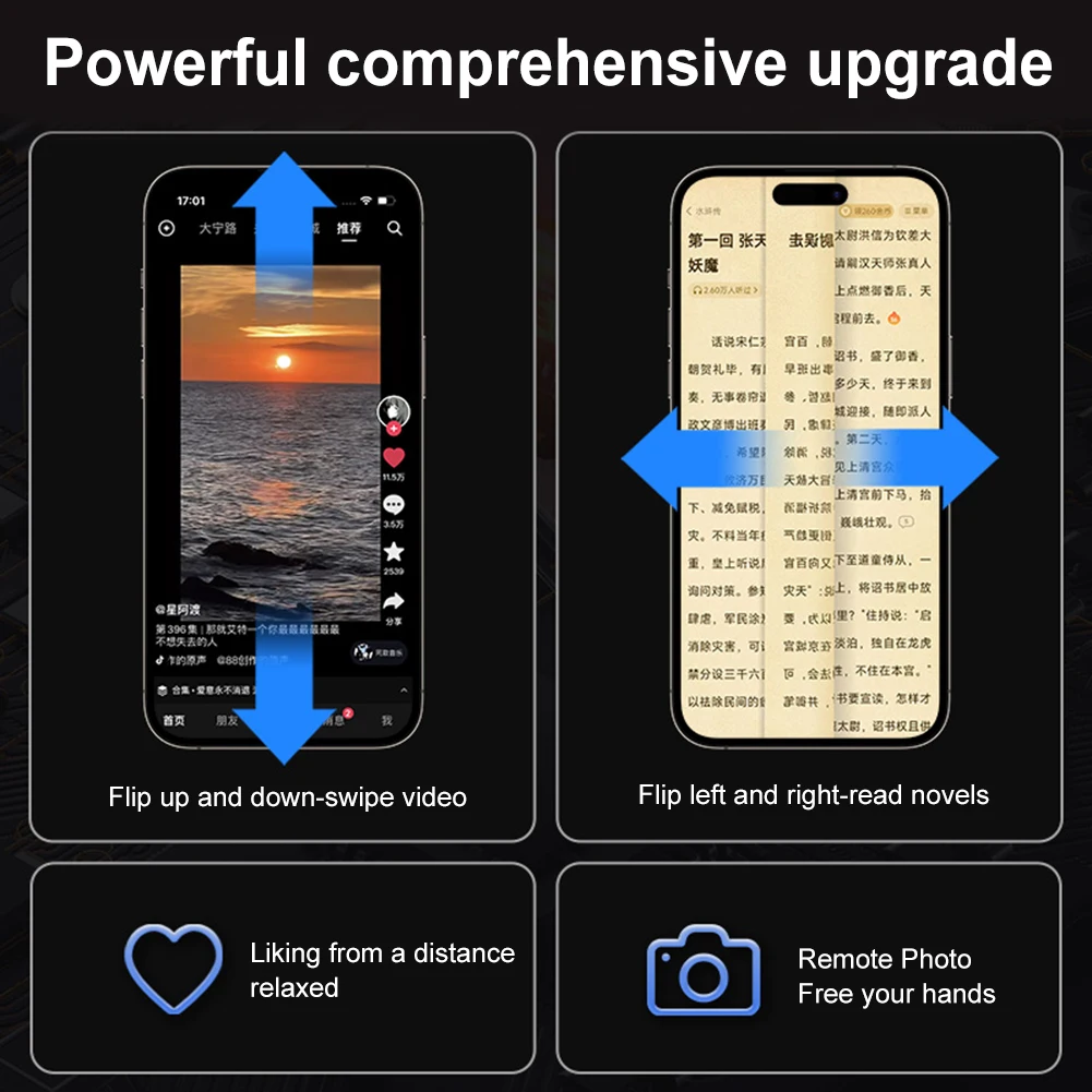 5. Diseño de anillo innovador:El control remoto compacto y liviano se adapta cómodamente a su dedo, diseñado ergonómicamente para evitar que se desprenda y reducir la fatiga durante el uso prolongado.