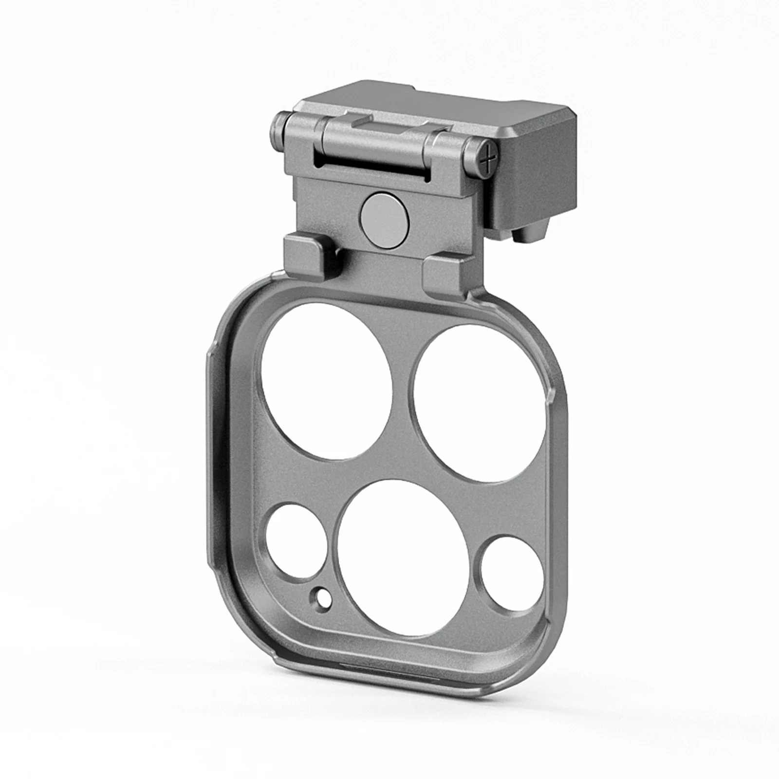 La bandeja cuenta con un soporte giratorio que permite que la bandeja se caiga en su lugar sobre las tres lentes del iPhone 15 Pro/Pro Max.