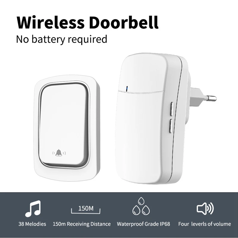 Comprar Timbre inalámbrico a prueba de agua IP68 para el hogar, 38 tipos de tonos de llamada, volumen ajustable de 4 niveles, enchufe europeo, botón autoalimentado, timbre de música