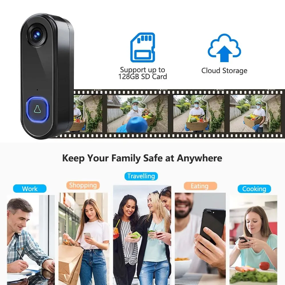 【Almacenamiento seguro en la nube y almacenamiento local】El timbre de video admite hasta 64G de almacenamiento (tarjeta SD opcional) y almacenamiento en la nube para su opcional, maximiza la seguridad de su privacidad personal y evita sus violaciones de datos. Nunca se perderá un momento con el control remoto y la reproducción de vídeo con el servicio en la nube encriptado dondequiera que esté.