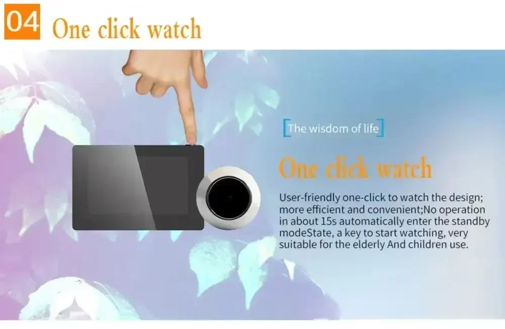 1.El producto se instala en la posición de la mirilla de la puerta, reemplazando el espejo óptico de la puerta y muestra claramente la imagen fuera de la puerta en la pantalla del anfitrión dentro de la puerta, lo que permite al propietario ver a los visitantes afuera de la puerta en casa y tomar fotografías manualmente.