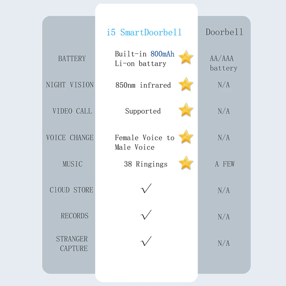 Característica:1.Timbre con vídeo inalámbrico avanzado:El i5 es un timbre inteligente visual de red VGA que cuenta con un procesador SOC BK7252 altamente integrado.Disfrute de un diseño compacto con flash incorporado, WiFi y Bluetooth para una conectividad y funcionalidad perfectas.