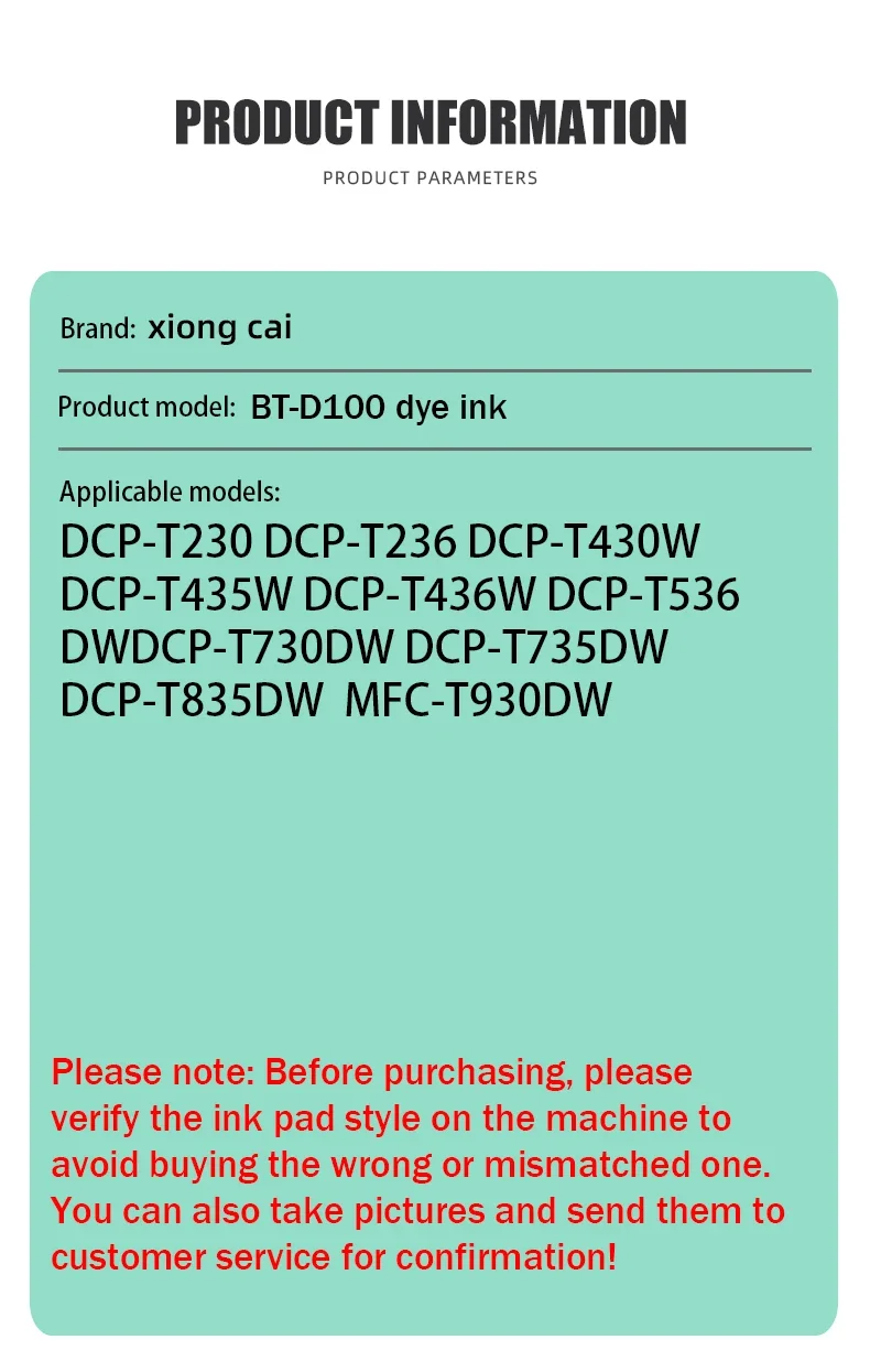 BT-D100 Tinta de tinte D100 Recambio de tinta Compatible con DCP-T230 T236 T238 T430 T435W T436W T439W T536W T730W T735W T830DW T835 MFC-T930