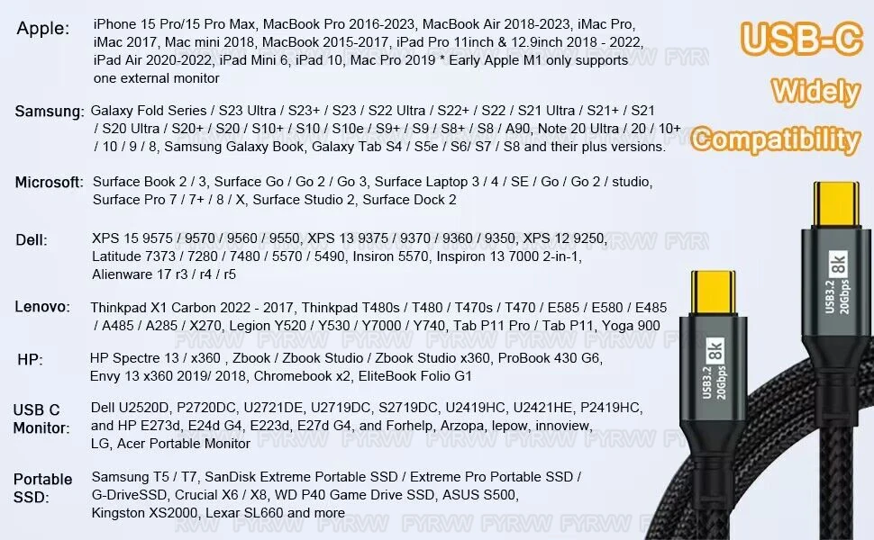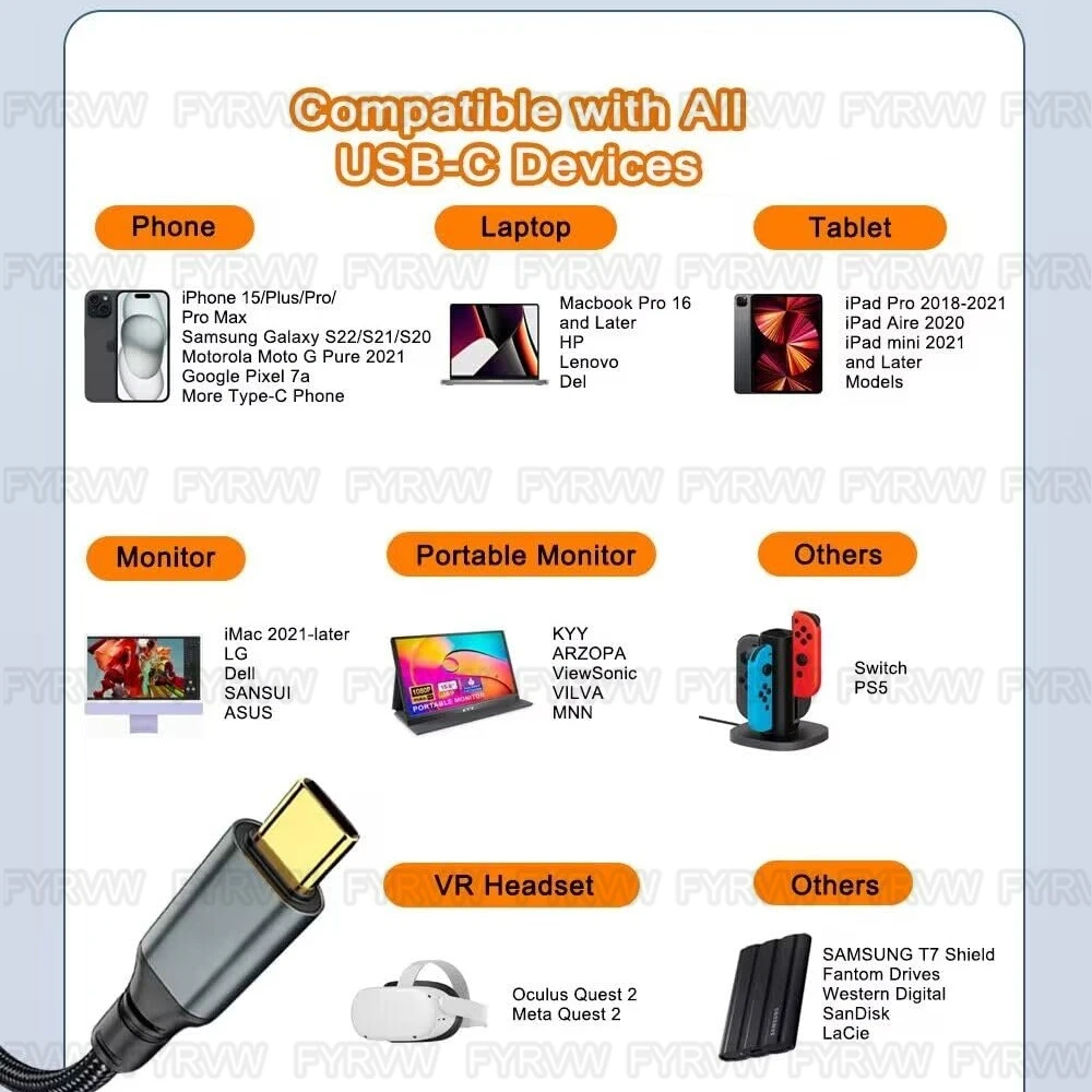 5、 El cable es compatible con todas las generaciones USB; USB 1. 1, 2. 0, 3. 0 y USB 3. 2 Gen 1/Gen 2 Lista de compatibilidad para portátiles/teléfonos inteligentes (no es una lista completa): MacBook Pro 2016-2017/2018/2019 iMac compatible con Microsoft Surface Book Thunderbolt de 3 puertos, Google Chromebook Pixel, Lenovo Yoga 900/910/920/720, ThinkPad P50/P70, Dell XPS, mDell Precision 5510, mDell Inspiration 15 7000, HP Spectre, Chromebook 13 G1, Nuevo Acer Switch Alpha 12, Acer Spin Todos los teléfonos móviles tipo C como Samsung Galaxy S8/S9/