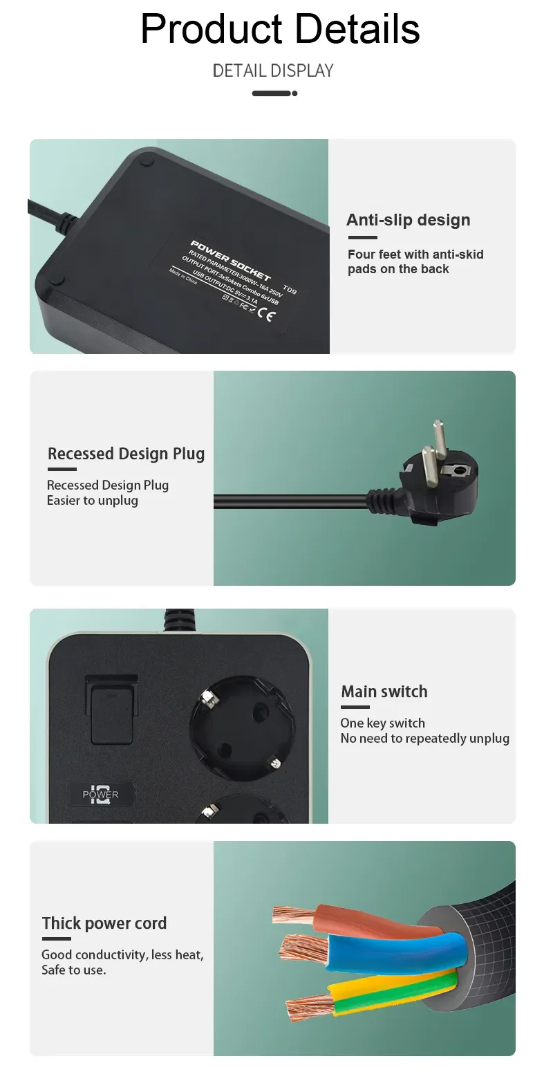 Diseño de la línea de alimentación de conexión, la longitud de la línea es de 2m/3m/5 metros, el cuerpo de la línea puede soportar alta corriente 16A,3000W de potencia, el cable y el enchufe cumplen con los estándares nacionales.