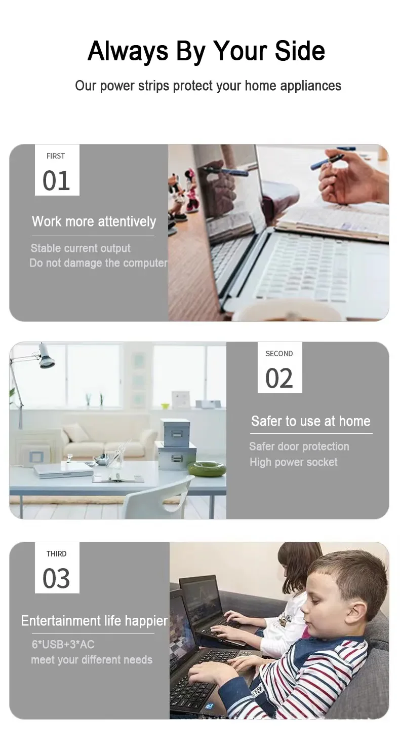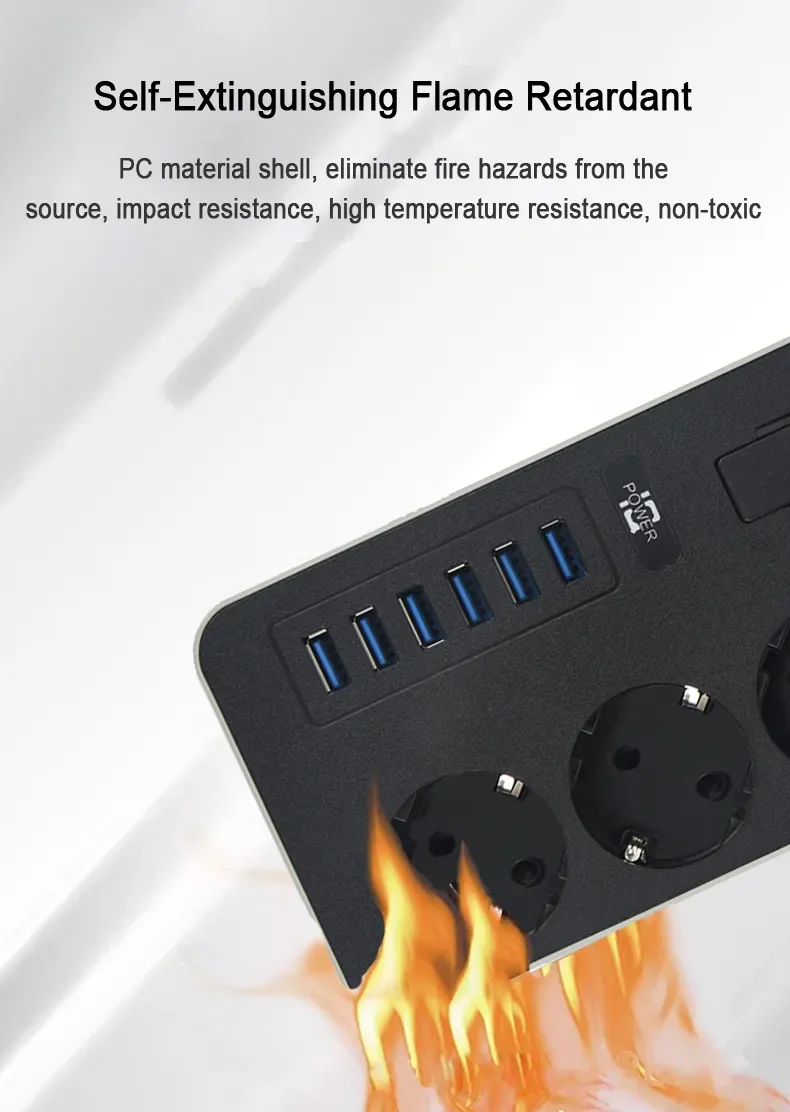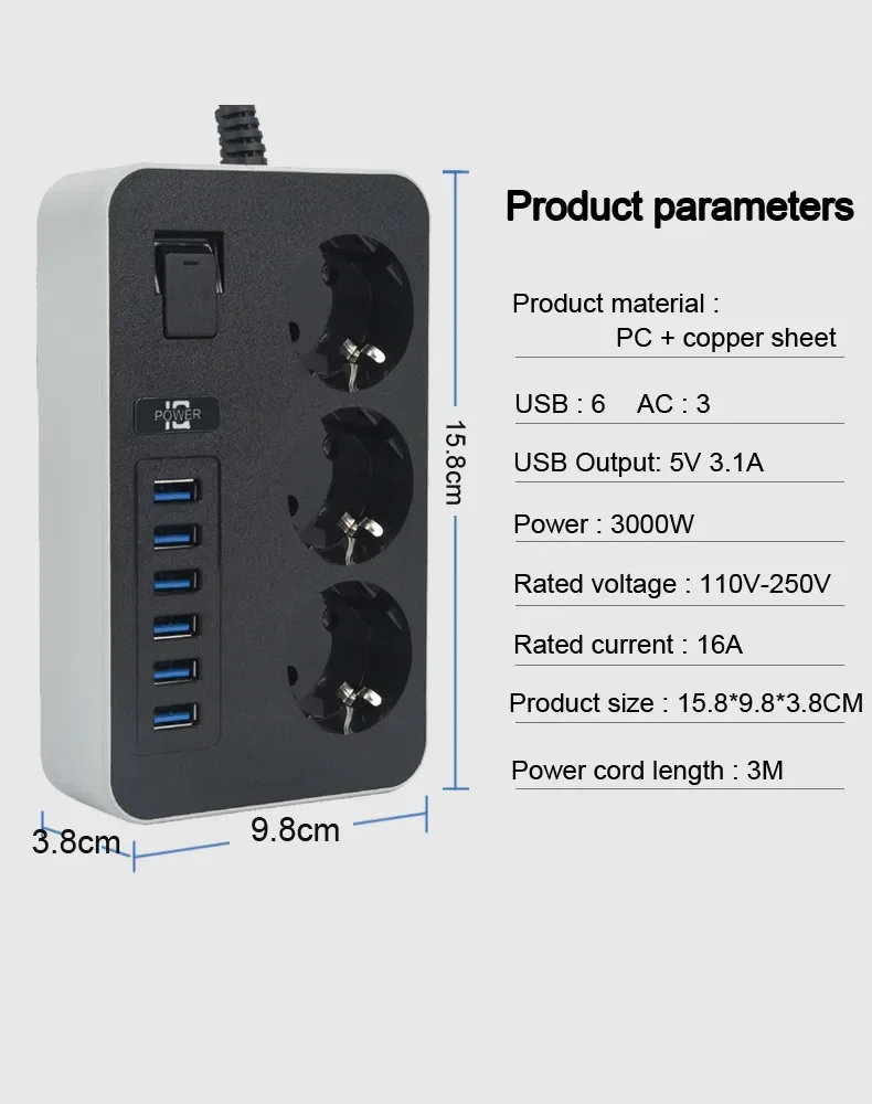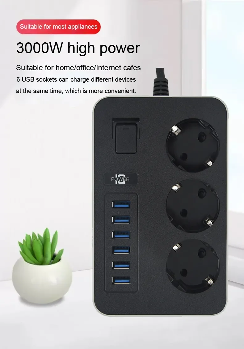 Puerto de salida: 3 enchufes + 6 puertos USB