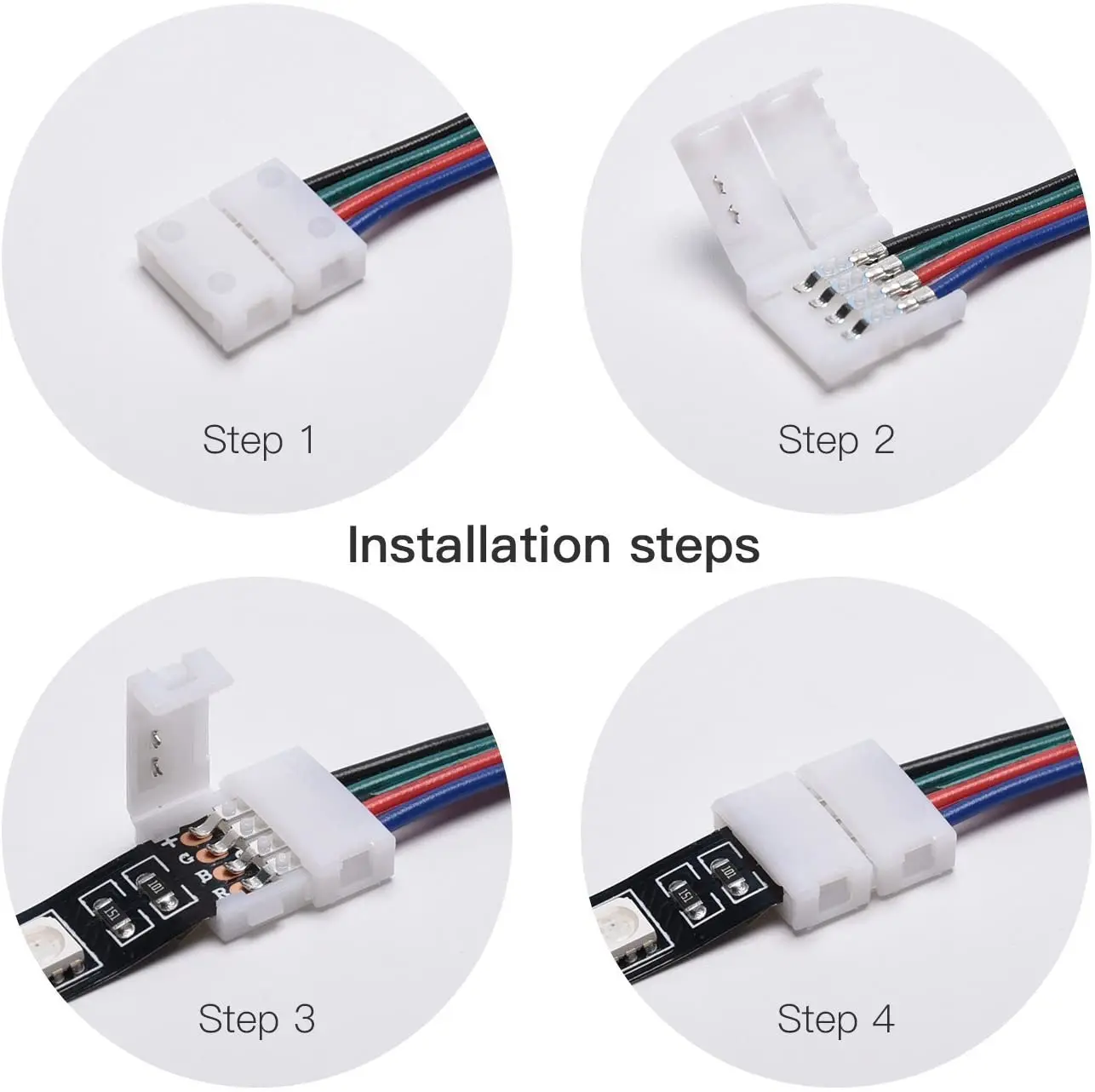 Para cualquier conector de 4 pines 10mm de ancho 5050 3528 RGB tira de luz LED. Adecuado para tiras de luz impermeables y no impermeables (retire la silicona en la superficie alrededor del área de la línea de soldadura antes de instalar las tiras impermeables).