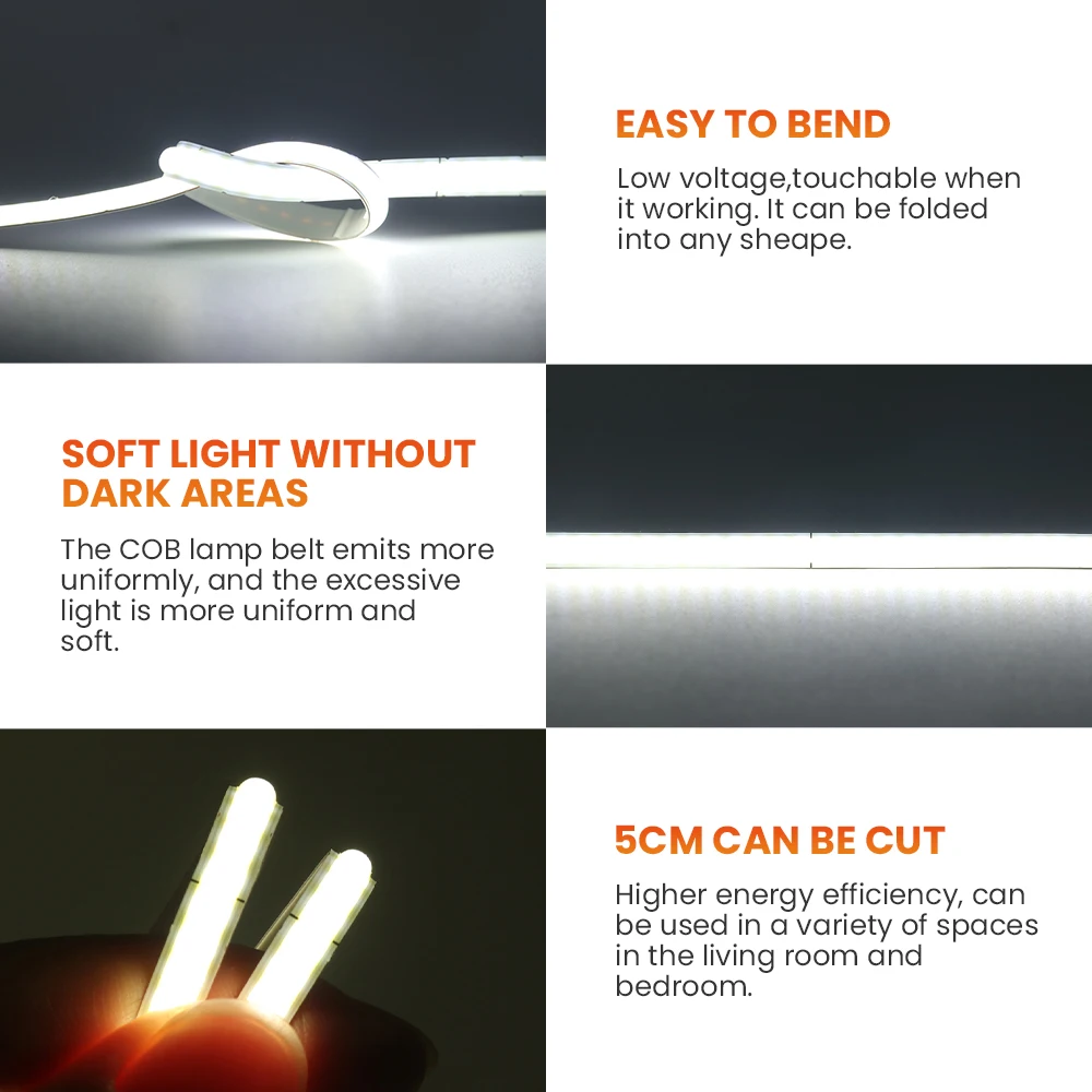 1.Chip LED COB flexible y de alta densidad, iluminación muy uniforme y suave, sin puntos de luz ni áreas oscuras.