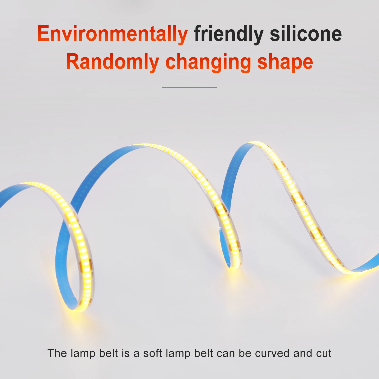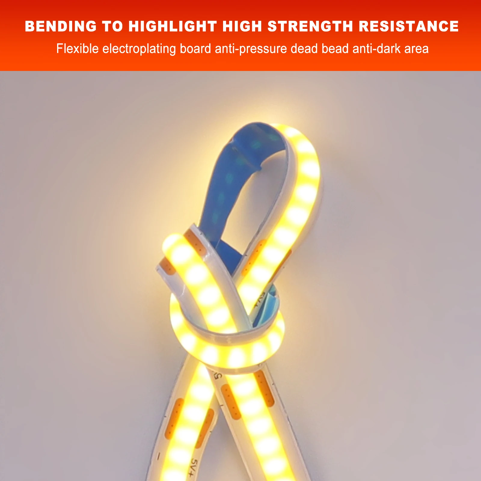 【Suave y ambiental】La cinta de luz LED COB tiene una superficie emisora de luz COB de alta densidad, el ángulo de flujo luminoso es de 180°, la luz es uniforme y suave, y el efecto es excelente.Cómodo y suave, inofensivo para la piel y los ojos.El índice de desarrollo del color es alto y el efecto de iluminación es bueno.