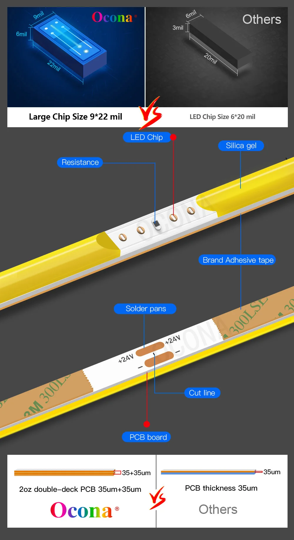 Fabricado con nueva tecnología LED COB, proporciona luz continua de alta densidad sin áreas oscuras ni puntos de luz.Mejor que el LED SMD, 480 LED por metro