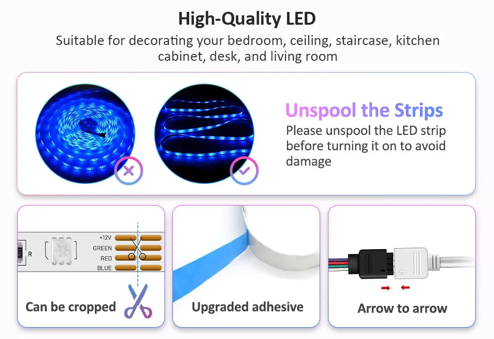 2. Desenrolla la tira LED antes de encenderla para evitar daños.