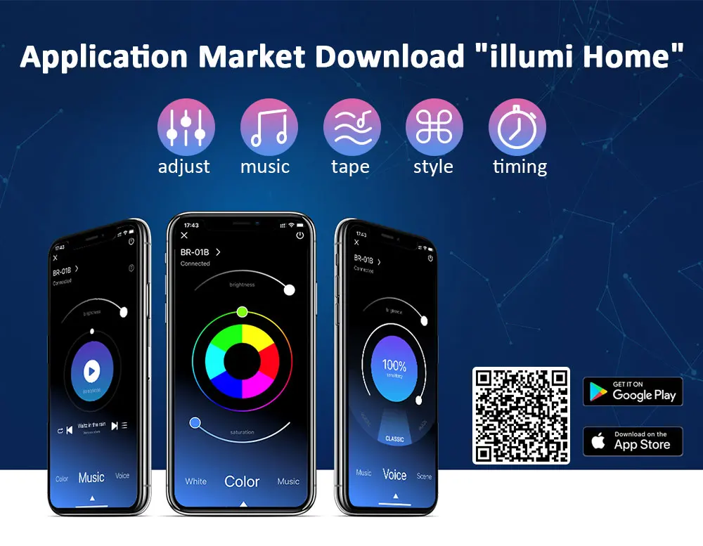 Tome el control completo de su iluminación en sus dispositivos móviles con la aplicación Illumi home a través de Bluetooth, ambos disponibles para dispositivos Apple y Android, cuando descargue la aplicación, luego encienda el Bluetooth, puedes conectar la luz automáticamente. Con la configuración del temporizador en la aplicación, puede configurar alarmas con estas luces (el control remoto de RF no está incluido porque está controlado por la aplicación).