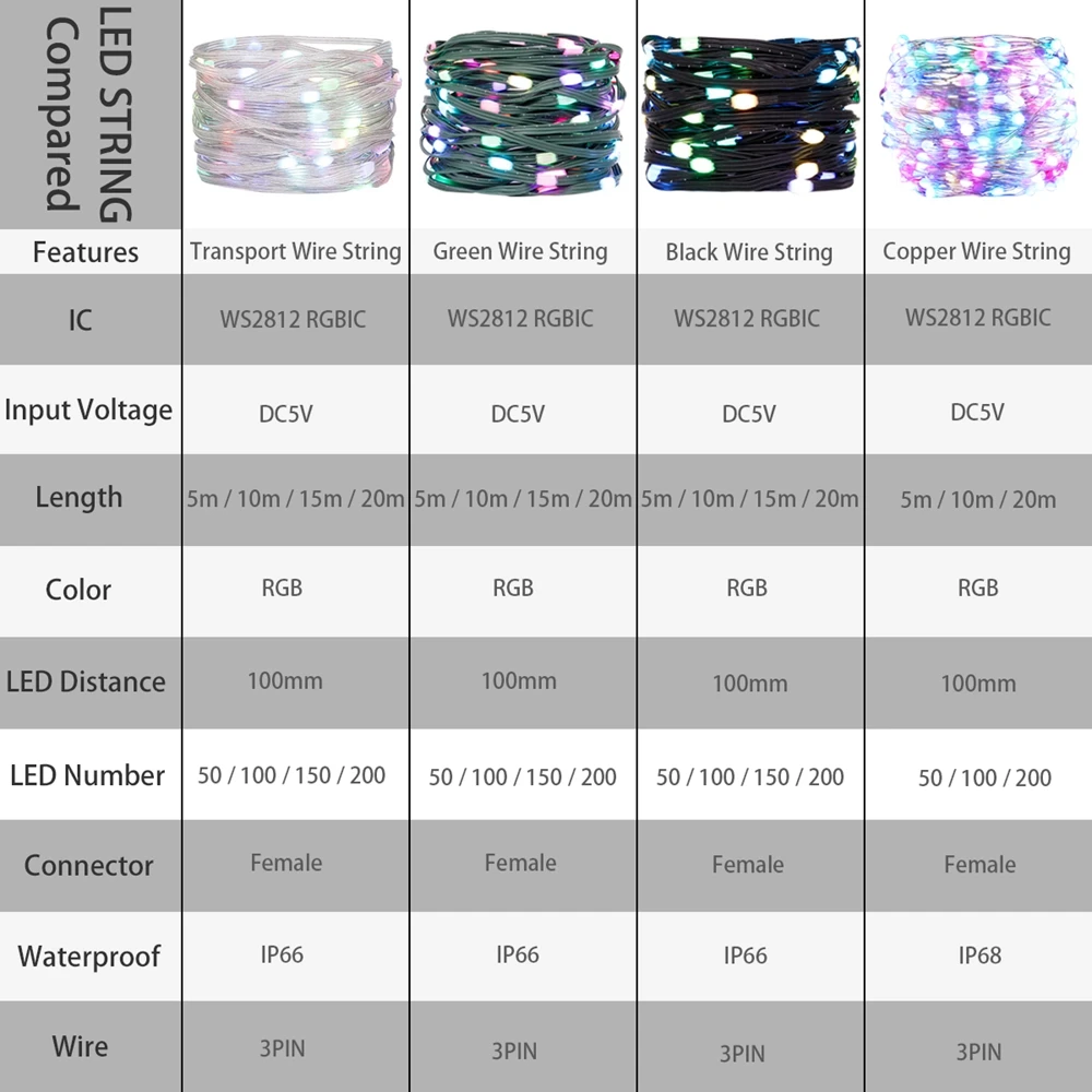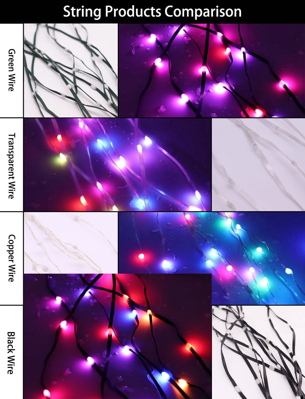 Cantidad de LED: 50 LEDs/5M de cuerda; 100 LEDs/10m de cuerda; 150 LEDs/15m de cuerda; 200 LEDs/20m de cuerda