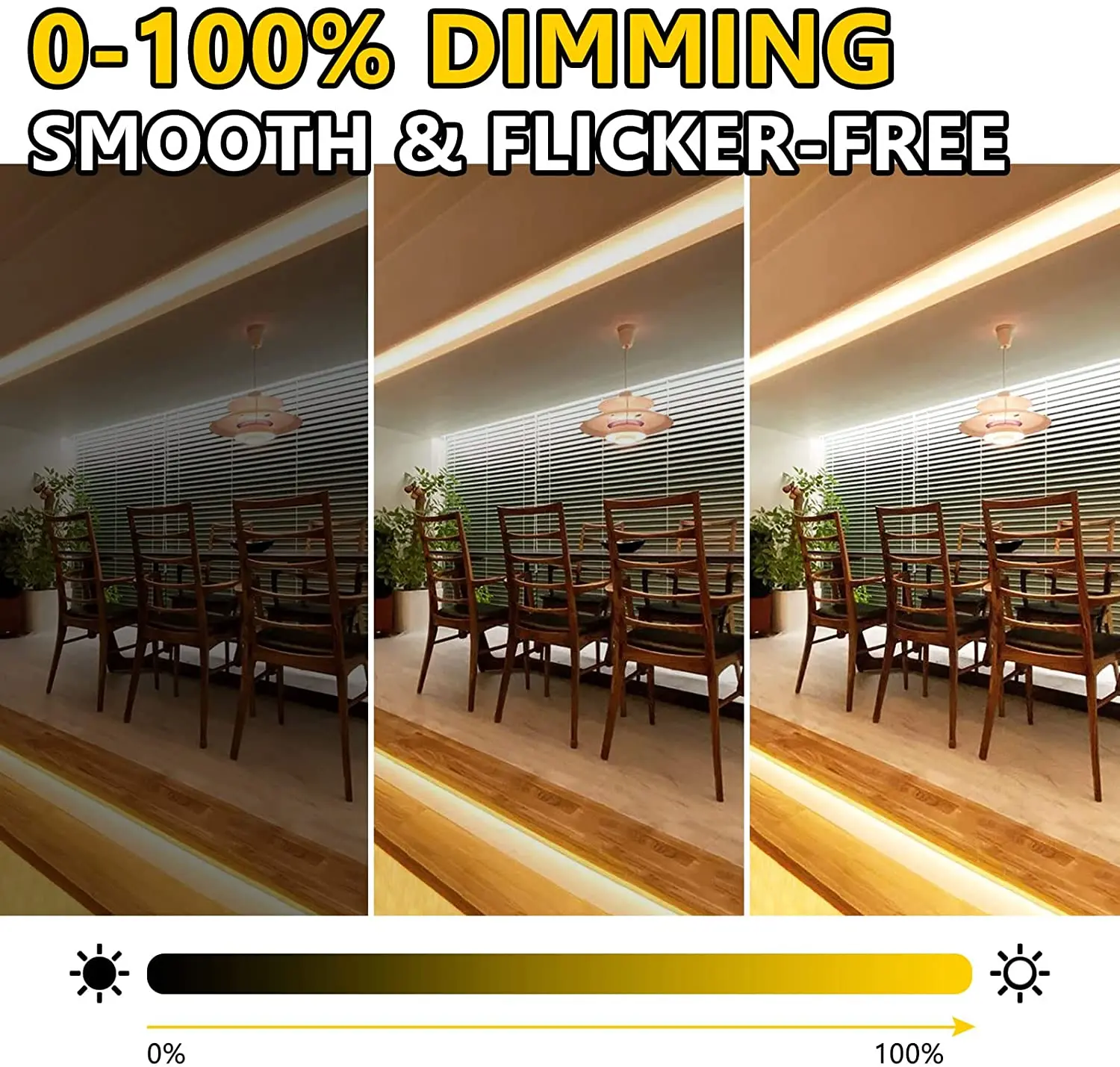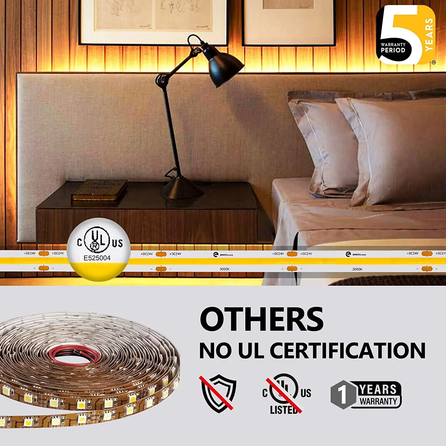 * La tira de luz COB de alta densidad tiene mayor brillo que las tiras LED tradicionales, su efecto de iluminación es una luz suave y acogedora, la luz de la tira COB debe ser mucho más uniforme,. Lineal y sin manchas. CRI 90;