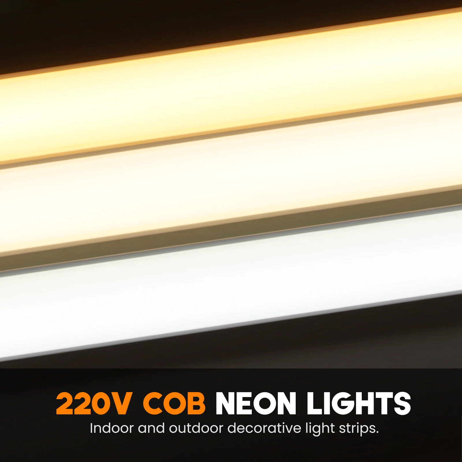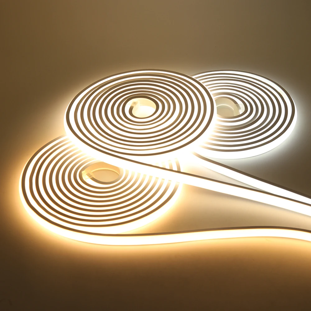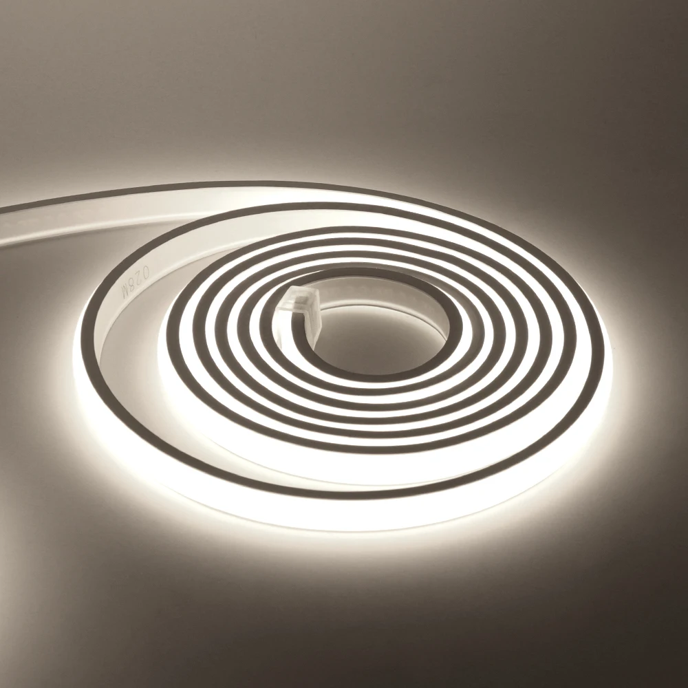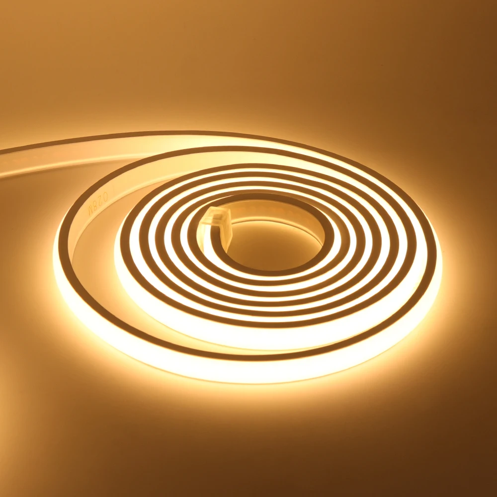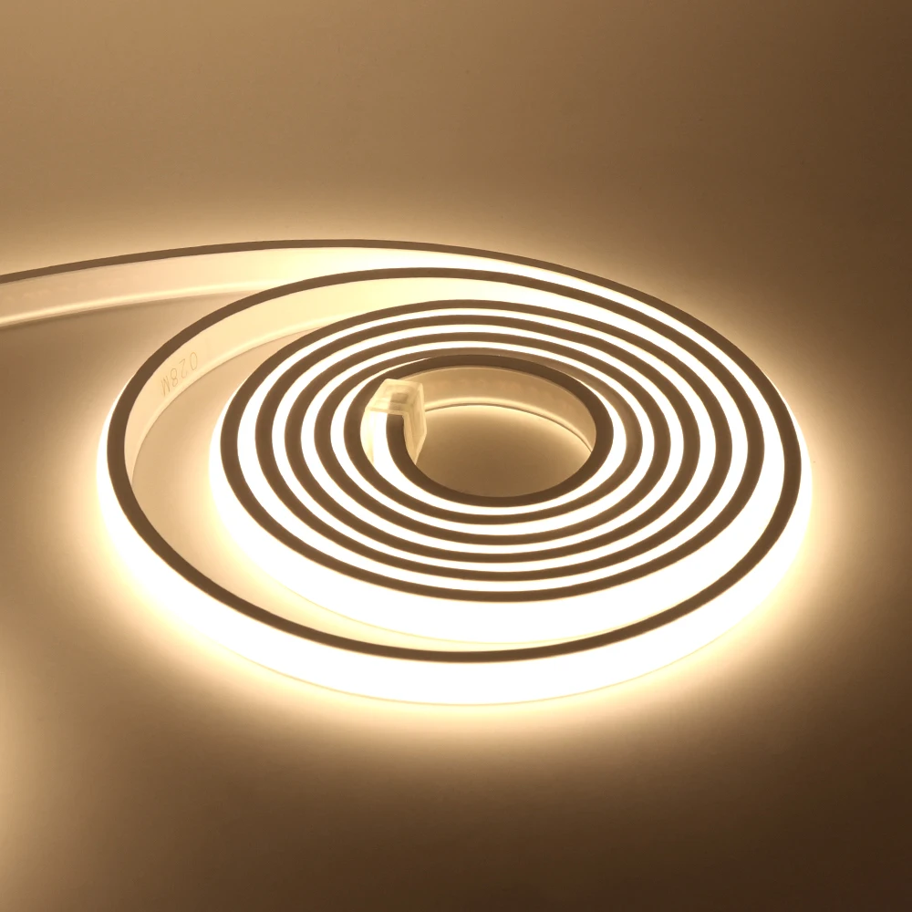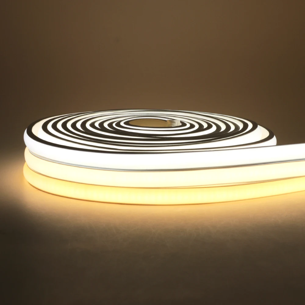 This is the Newest 220V COB flexible neon light with white silicone backing, easy to bend, with high brightness, uniform color, high CRI, no dark area and stable quality, suitable for engineering decoration.