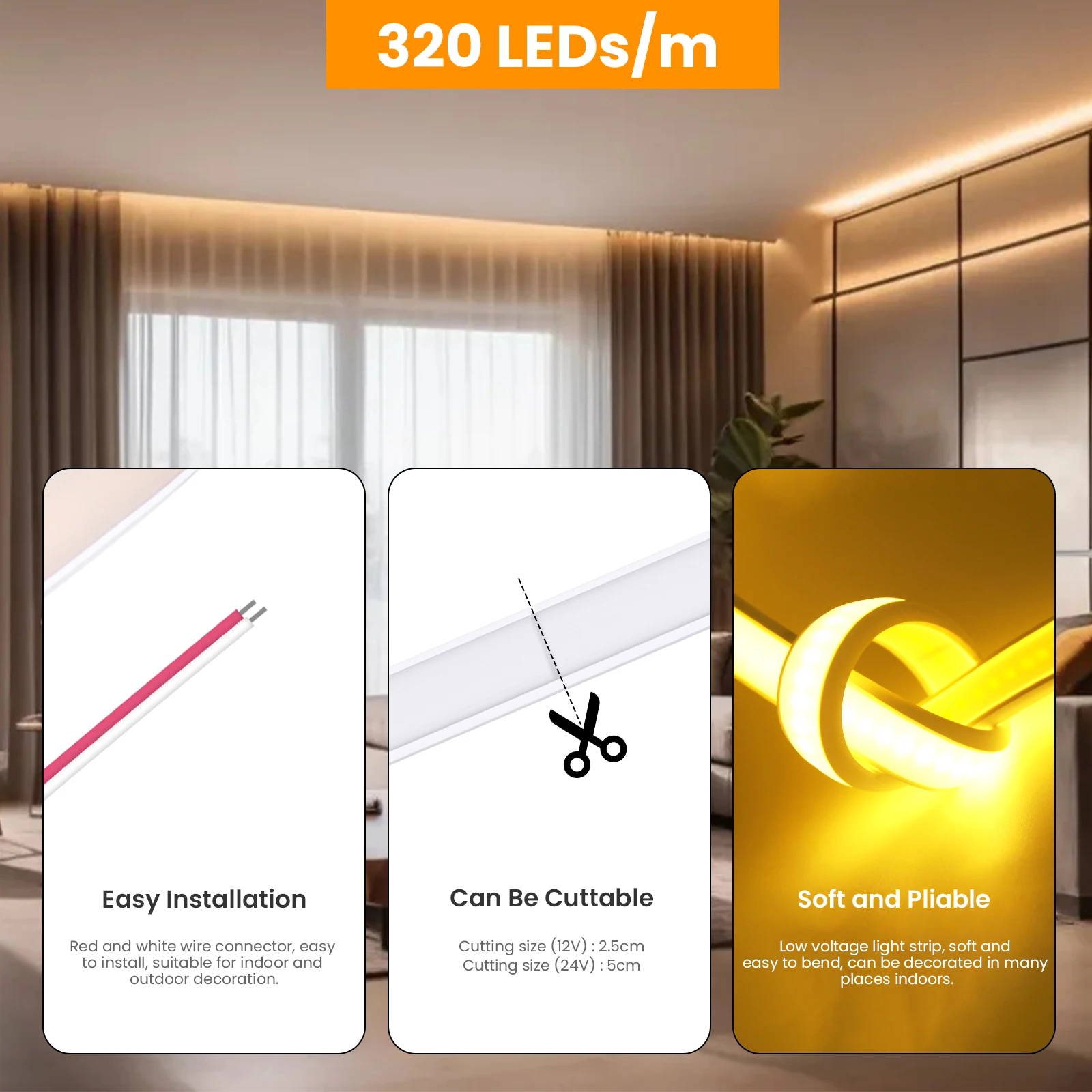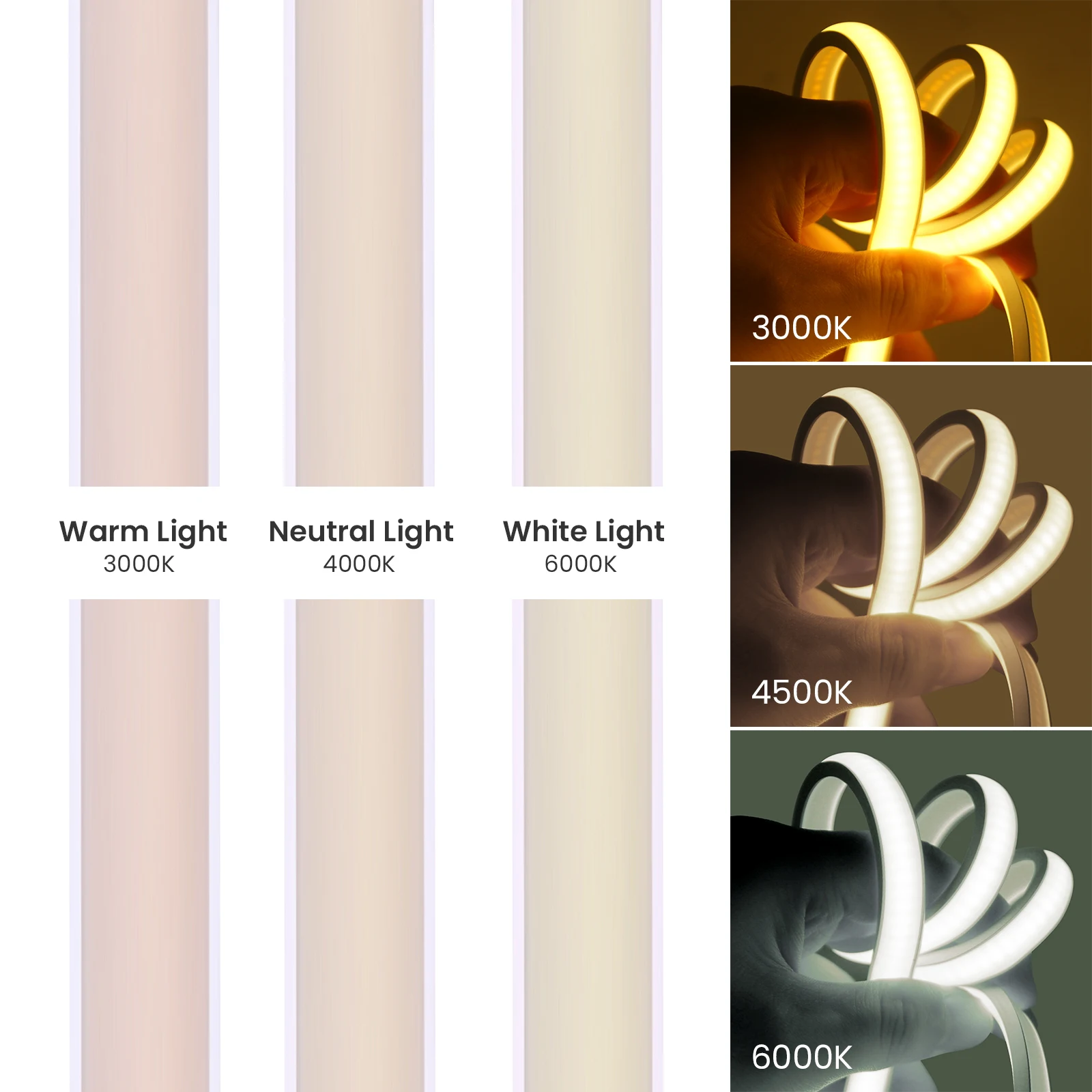 Esta es la nueva luz de neón COB DC12V/24V con una gran superficie luminosa, fácil de doblar, con alto brillo, color uniforme, alto CRI, sin área oscura y calidad estable, adecuada para decoración de ingeniería.