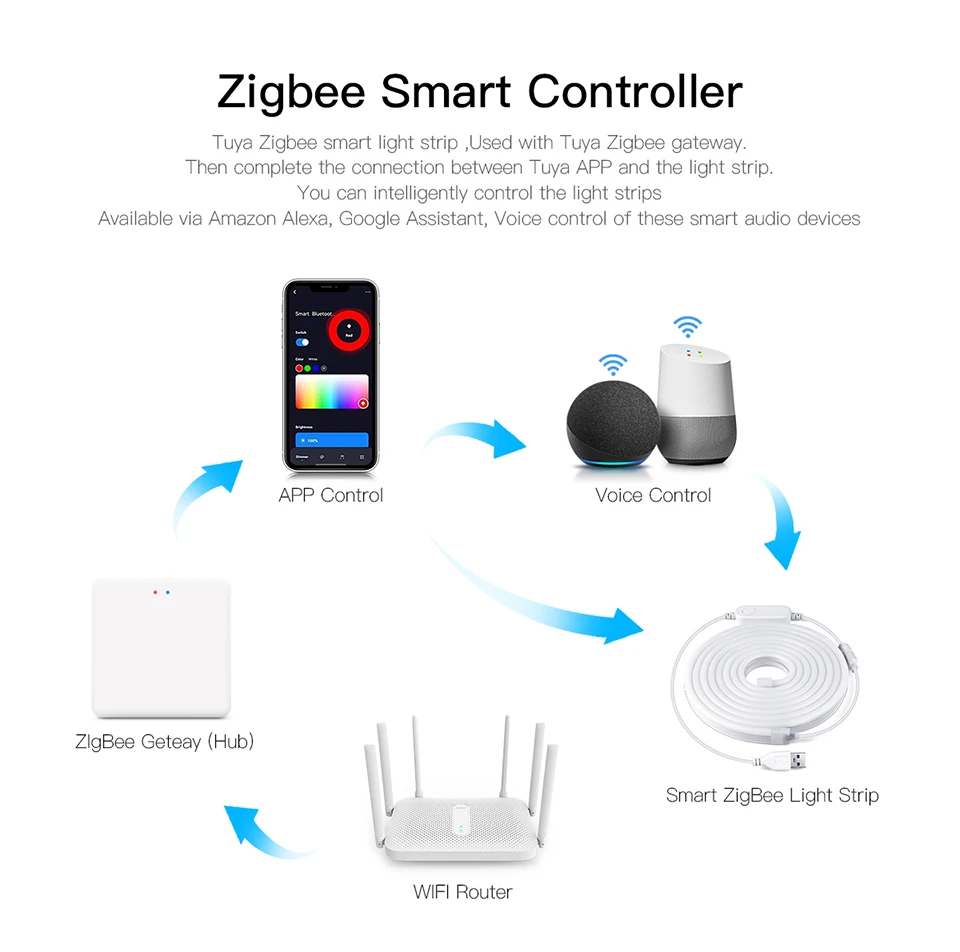 2. Controlador LED Zigbee 3.0.No puede funcionar sin Bridge, Tuya Gataway o SmartThings.Compatible con puente o coordinador Zigbee general y conexión más estable y conveniente con ZigBee Gateway. Trabaje con Tuya Bluetooth/WiFi Dual-Mode Gateway, puede admitir control de voz de terceros como Alexa, Google Home.