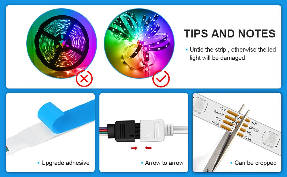 2. Desata la tira antes de usarla, de lo contrario la luz LED se dañará.