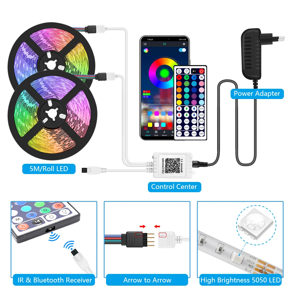 Tira de luces LED RGB 5050 Cinta flexible Fita tira de luces LED Diodo de cinta RGB DC 12V + Control remoto 5M 10M