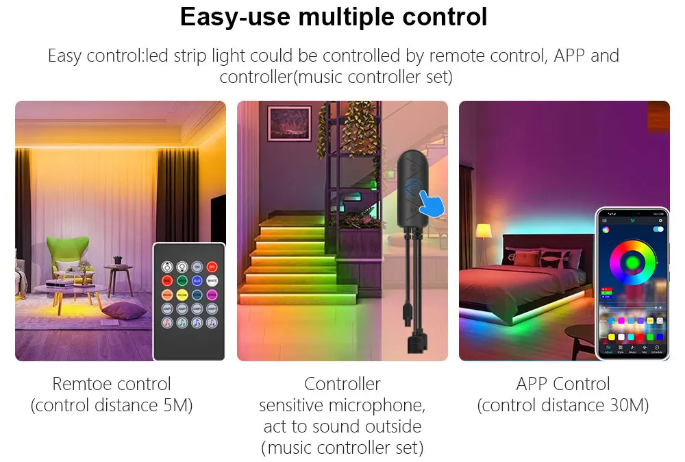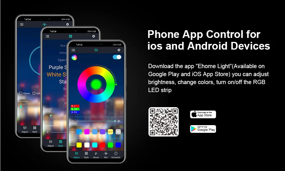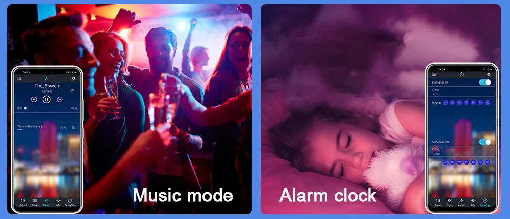 Puede configurar un temporizador para encender/apagar las luces con su color favorito, también puede controlar las tiras de luz a una distancia de respuesta de 50 pies a través de la aplicación del teléfono