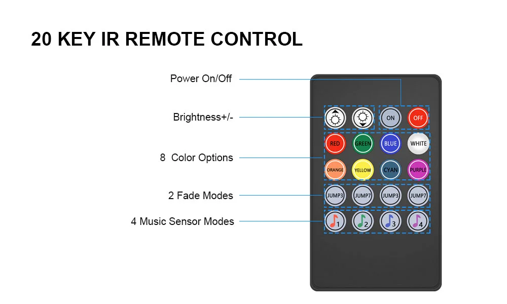 Modo de música fantástico, micrófono integrado de alta sensibilidad, los colores cambian automáticamente según los latidos de la voz y el ritmo de la música. Comienza la fiesta de música con esta tira de luces. Puede crear un ambiente romántico, hermoso, interesante y mágico para su fiesta. Hará que su tiempo de fiesta sea más memorable y sobresaliente.