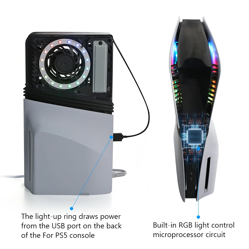 2.Tiras de luces circulares LED RGB vibrantes:Transforma tu consola con estas tiras de luces circulares LED RGB, que ofrecen una deslumbrante variedad de colores y efectos.Se conecta fácilmente a los ventiladores de refrigeración de la consola para crear una atmósfera de juego dinámica.