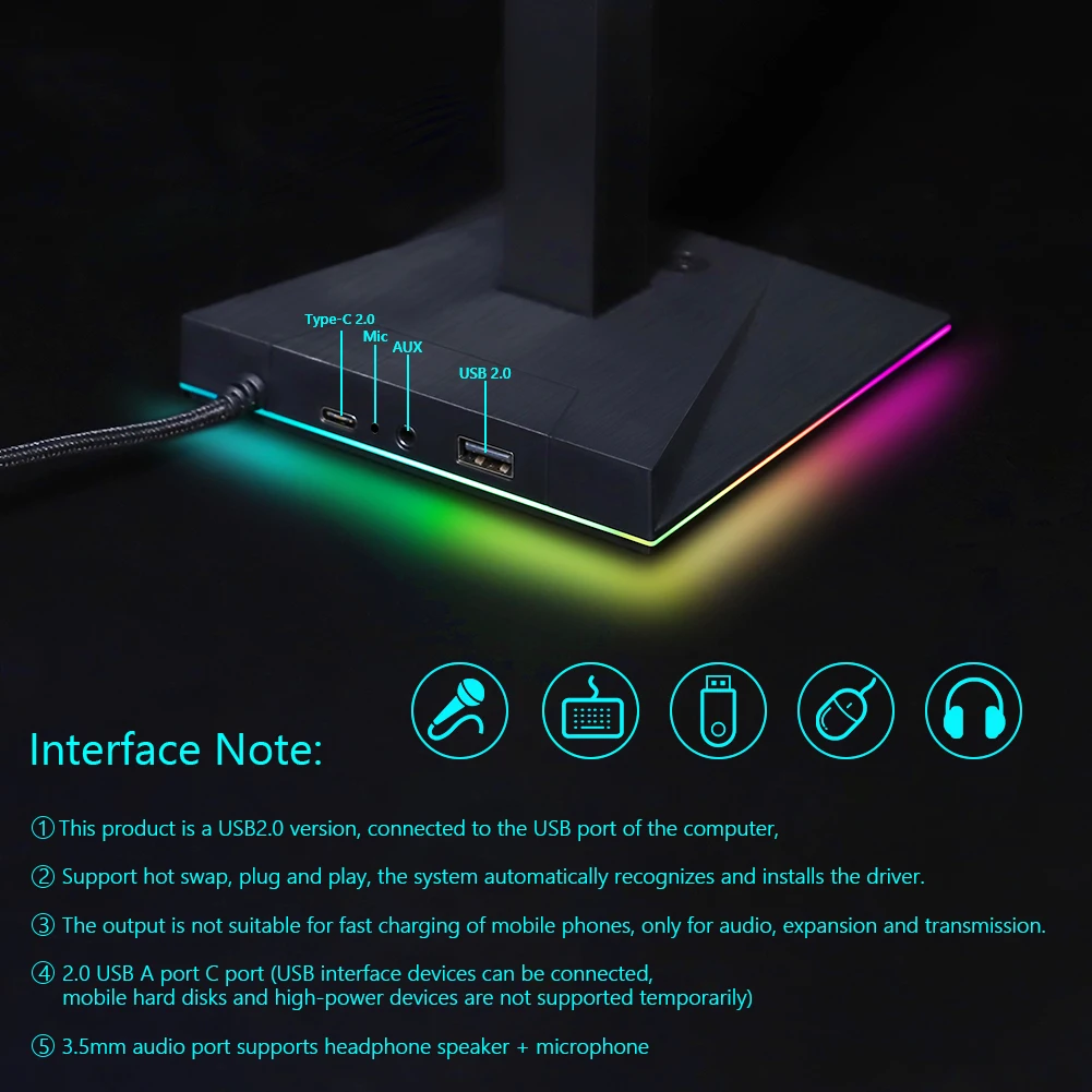 Especificación: Artículo: Soporte de auriculares multifuncional RGB luminoso pickup Rhythm Color: negro Material: ABS Entrada: computadora USB2.0/interfaz 3,0 Salida: USB2.0 + Tipo-C 2,0 + audio 3,5mm + interfaz de micrófono Efecto de iluminación del soporte: 9 modos de ritmo de recogida + 1 modo de carreras de streamer Efecto de iluminación base: 17 modos (6 efectos de iluminación dinámicos + 11 efectos de iluminación constante monocromática media). Tamaño del producto: 283*115*115mm/11,14*4,53*4,53'' Tamaño del embalaje: 310*165*27mm Peso del producto: 350g Cable del producto: cable de datos USB SR trenzado negro de 1,6 M Botón de interruptor de efecto de iluminación de poste de soporte: Presione brevemente 10 modos de efecto de iluminación de ritmo de recogida + 2 modos de Efecto de iluminación de marquesina de serpentina; Mantenga presionado durante 2 segundos para ajustar el brillo en 3 niveles; Mantenga presionado durante 4 segundos para apagar/presione brevemente para encender (aplicable a cualquiera de los modos de efecto de luz anteriores); Memoria de almacenamiento de apagado (puede seleccionar cualquiera de los modos de efecto de luz anteriores por defecto). Base + LOGO botón de cambio de efecto de iluminación: Presione brevemente 11 tipos de modos de efecto de luz estática monocromática + 6 tipos de modos de efecto de luz dinámica; Mantenga presionado durante 2 segundos para ajustar el brillo en 3 niveles; Mantenga presionado durante 4 segundos para apagar/presione brevemente para encender (aplicable a cualquiera de los modos de efecto de luz anteriores); Memoria de almacenamiento de apagado (puede seleccionar cualquiera de los modos de efecto de luz anteriores por defecto). Nota de interfaz: Este producto es una versión USB 2,0, conectada al puerto USB del ordenador, Admite intercambio en caliente, Plug and Play, el sistema reconoce e instala automáticamente el controlador. La salida no es adecuada para la carga rápida de teléfonos móviles, solo para audio, expansión y transmisión. Puerto 2,0 USB A Puerto C (se pueden conectar dispositivos de interfaz USB, los discos duros móviles y los dispositivos de alta potencia no son compatibles temporalmente) Puerto de audio de 3,5mm compatible con altavoz de auriculares + Micrófono Nota: Debido a los diferentes monitores y efectos de luz, el color real del artículo puede ser ligeramente diferente del color que se muestra en las imágenes. ¡Gracias! Permita una desviación de medición de 1-2cm debido a la medición manual. 1 x ![]() ![]() ![]() ![]() ![]() ![]() ![]() ![]() ![]() ![]() ![]() ![]() ![]() ![]() ![]() |