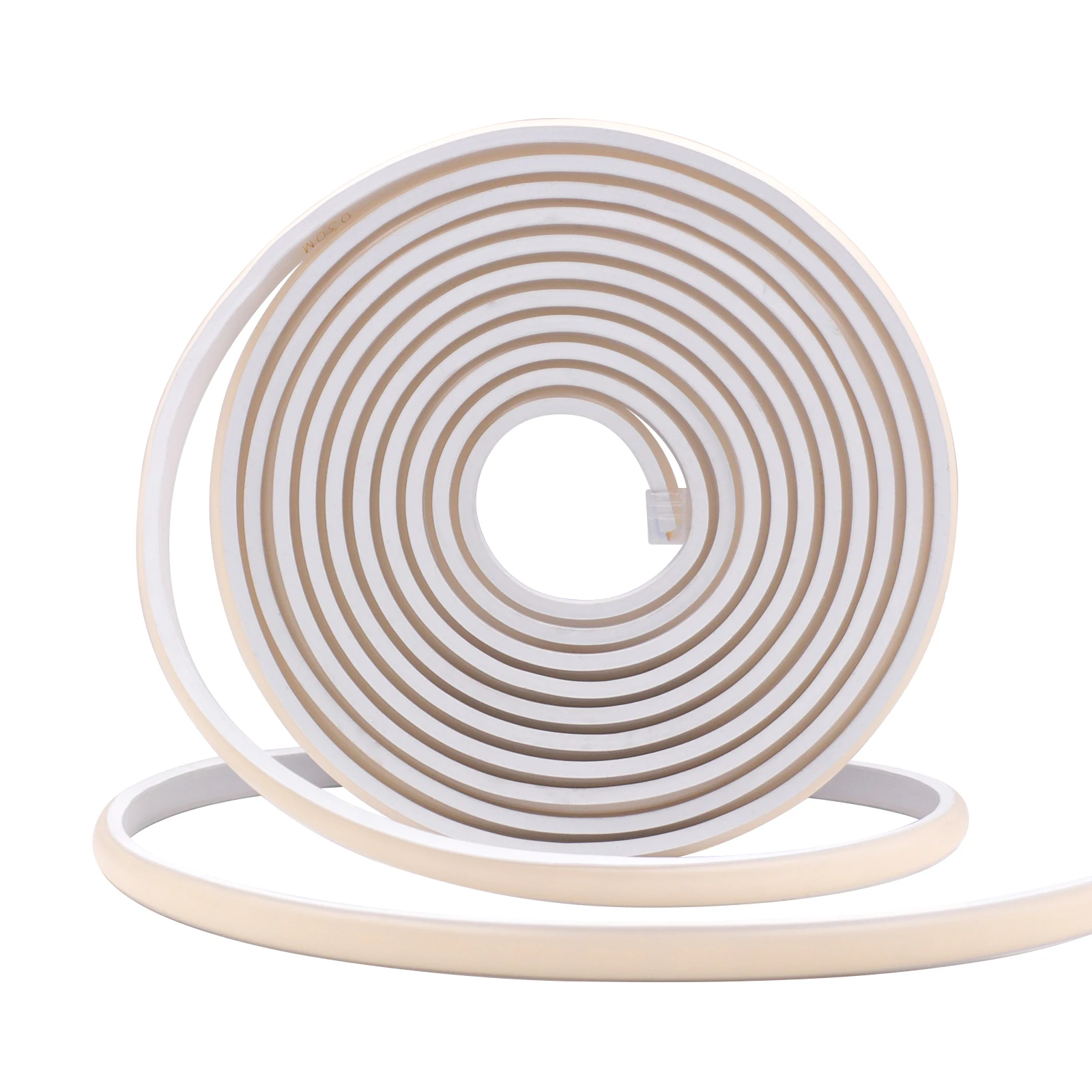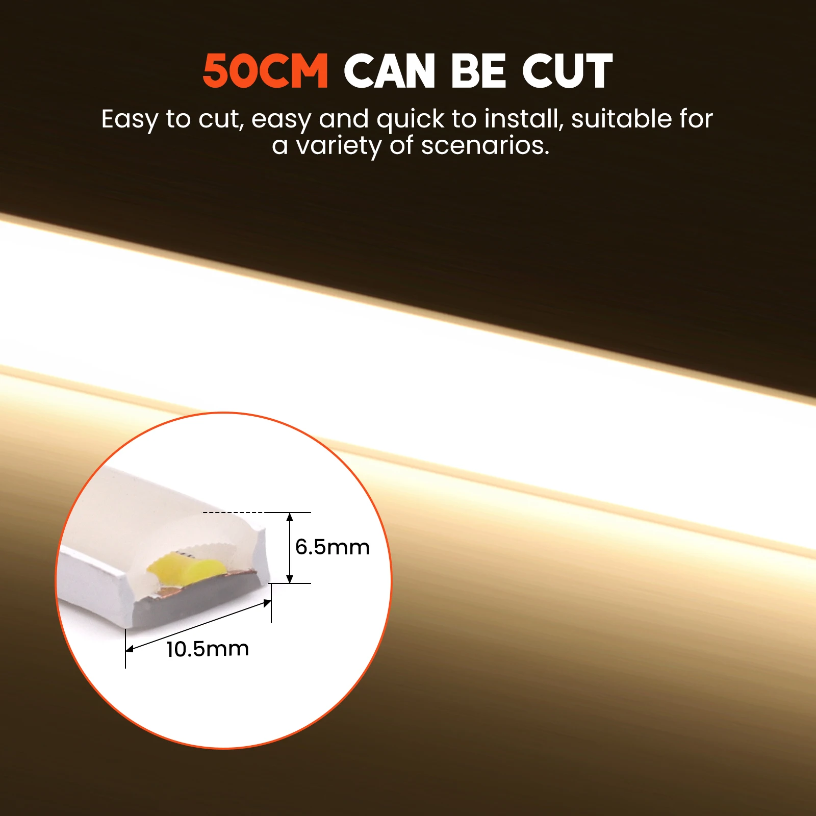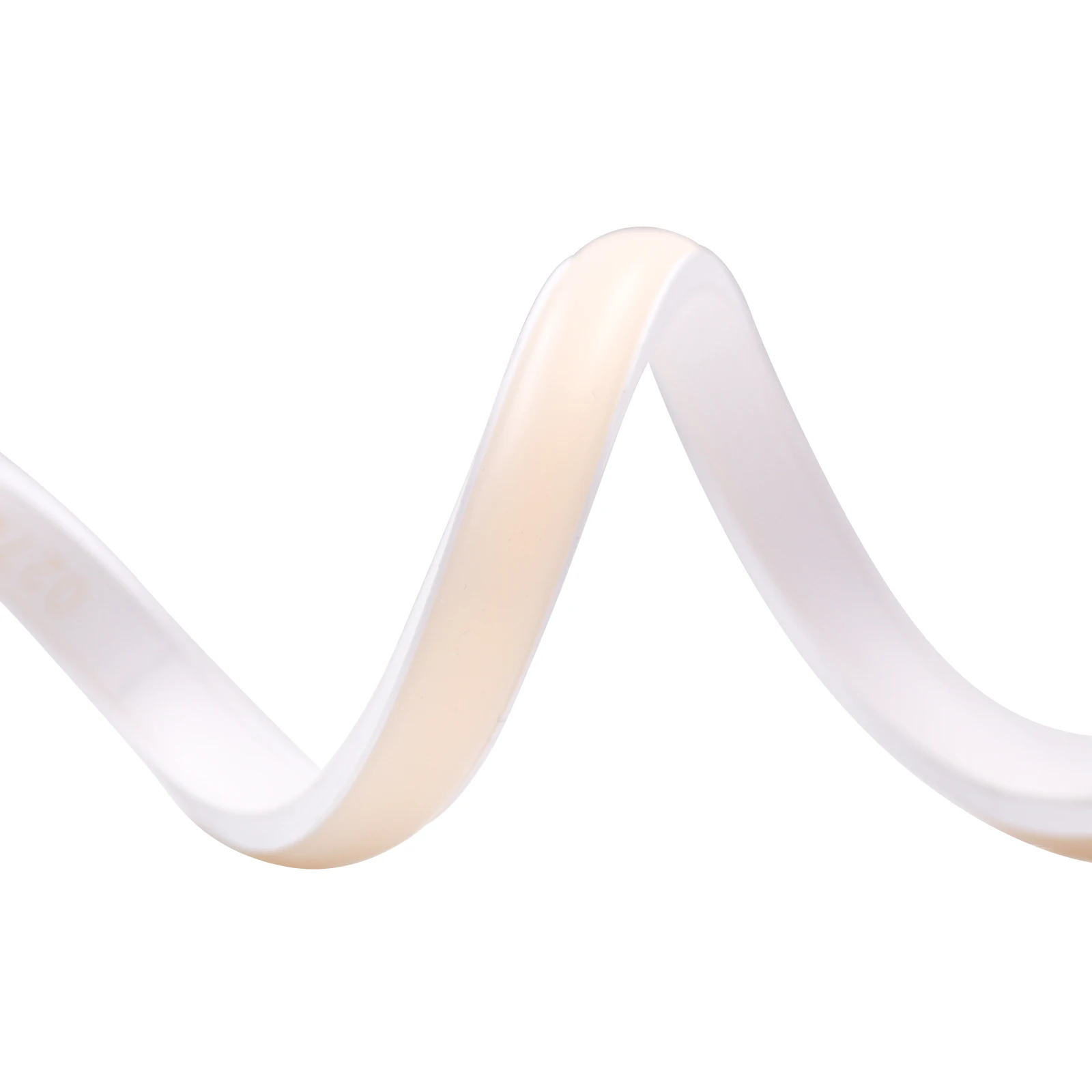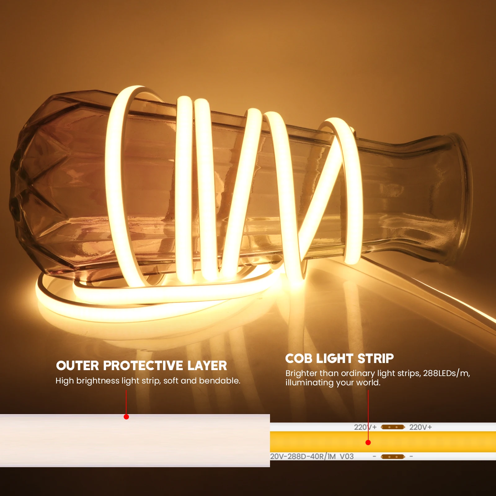 This is the 220V COB flexible neon strip light with white silicone backing, easy to bend, with high brightness, uniform color, high CRI, no dark area and stable quality, suitable for engineering decoration.