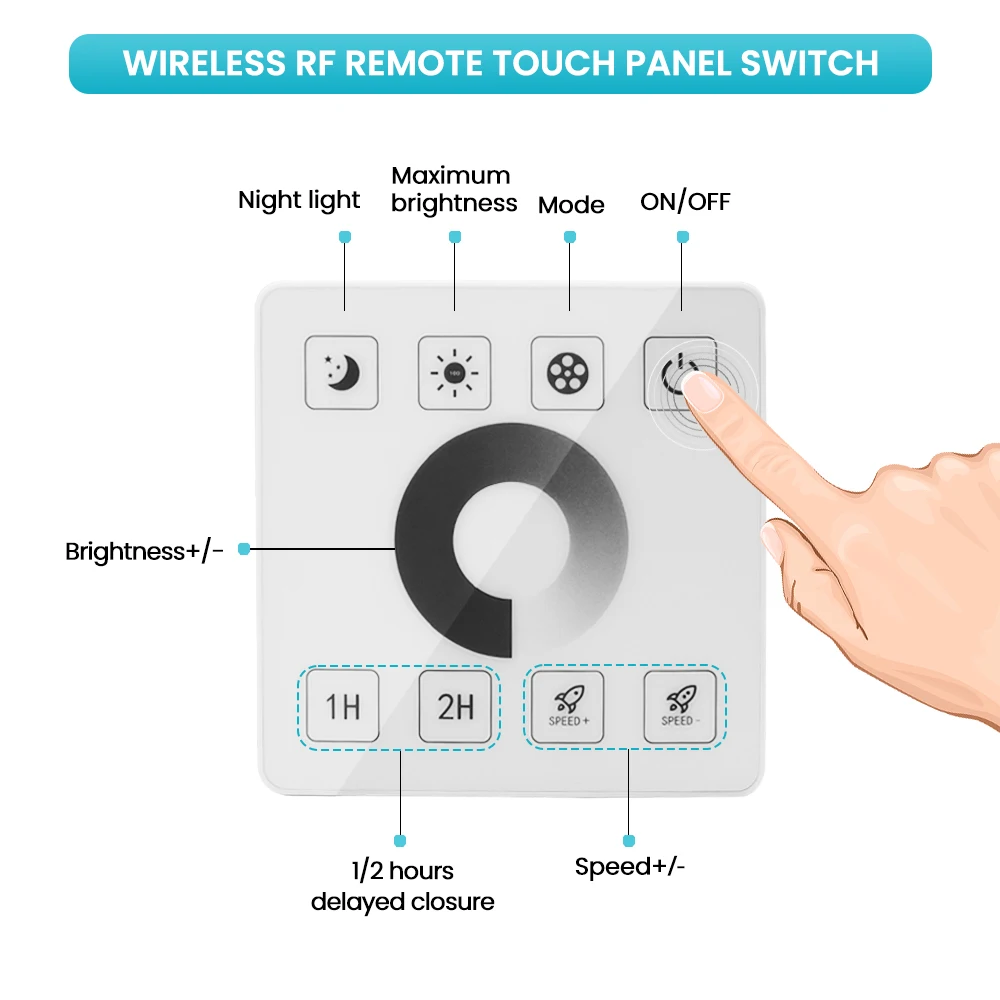 Wall Touch panel RF 750W Controller, Control distance: 10-20 meters. The touch panel can be fixed with double-sided tape or screws for easy installation. The touch panel does not come with a battery and requires a CR2025 button battery to work.