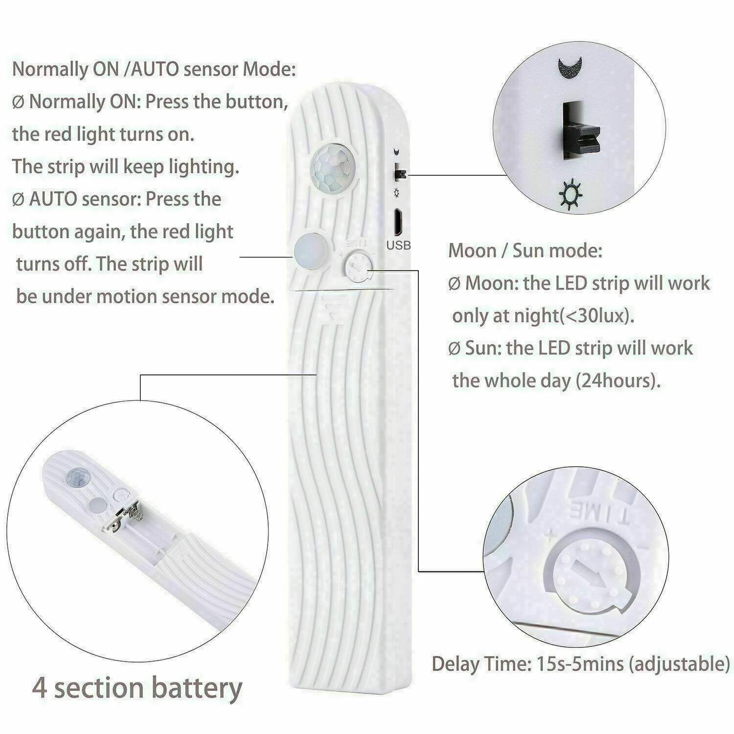 Power Plug: USB plug/4xAAA battery, can work with power back, TV, computer, USB socket etc.