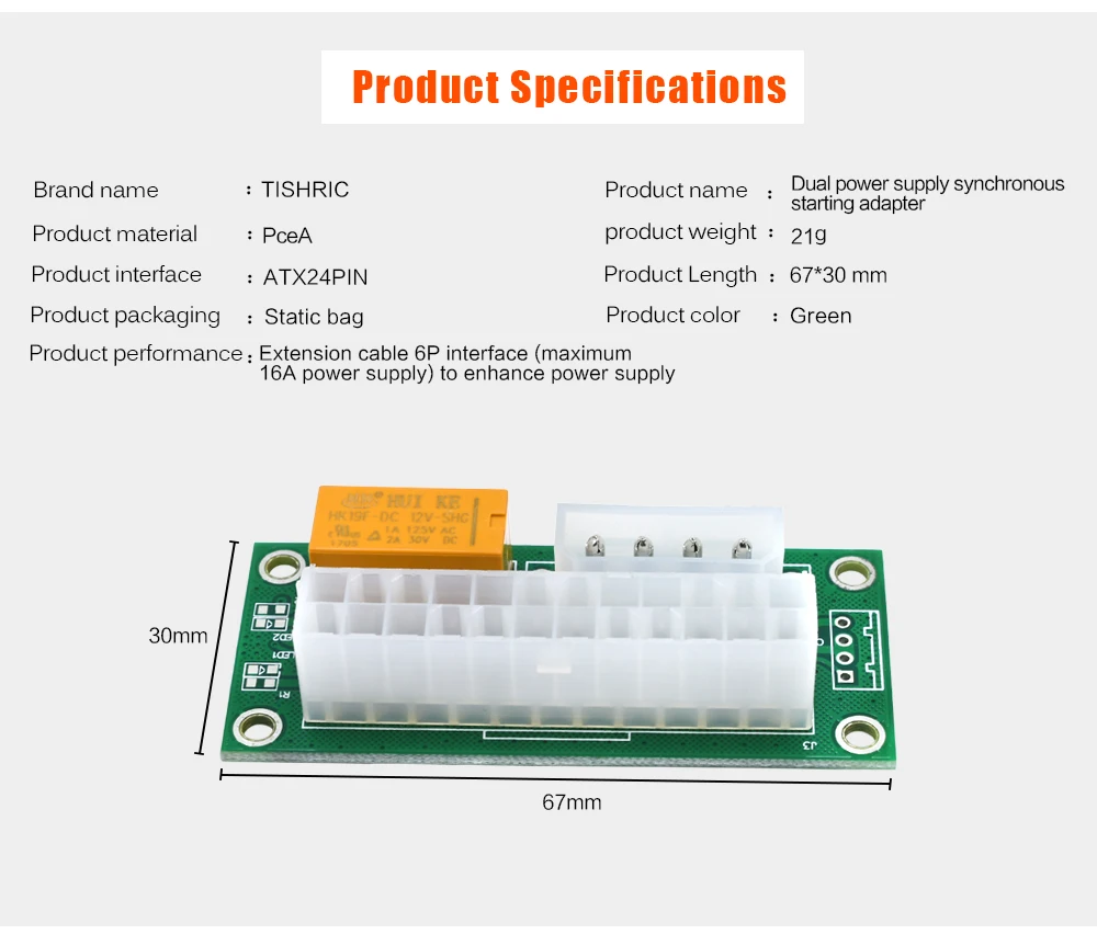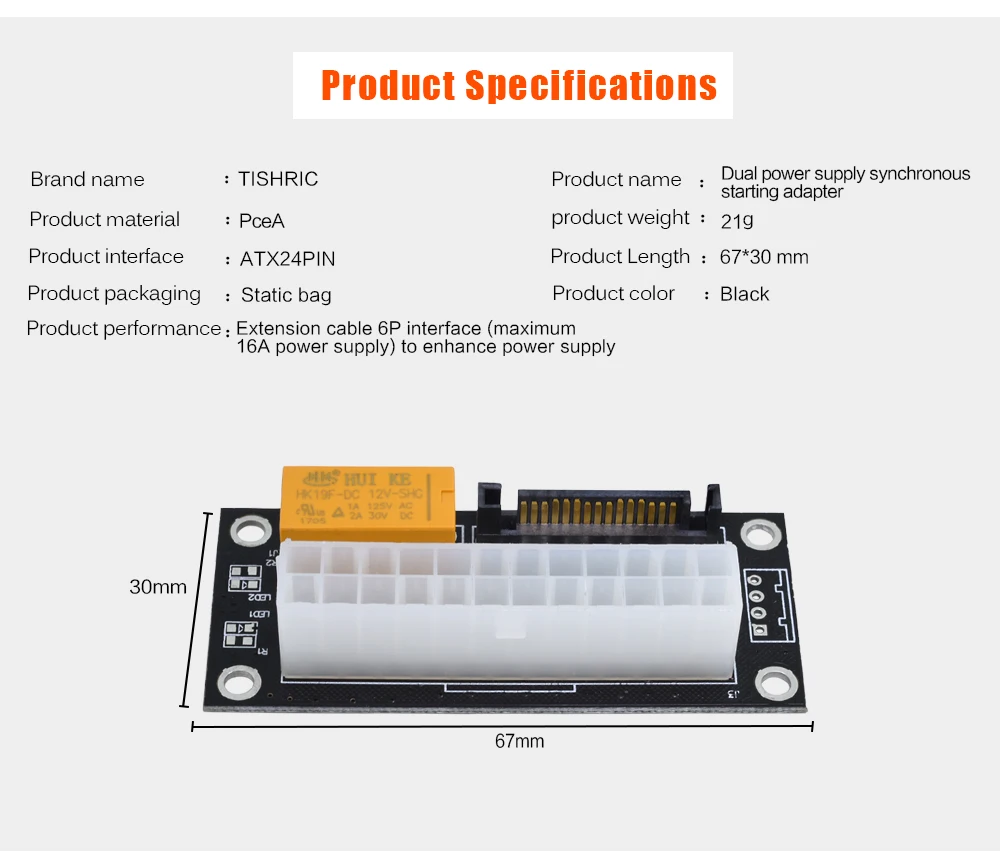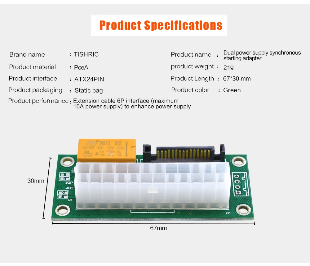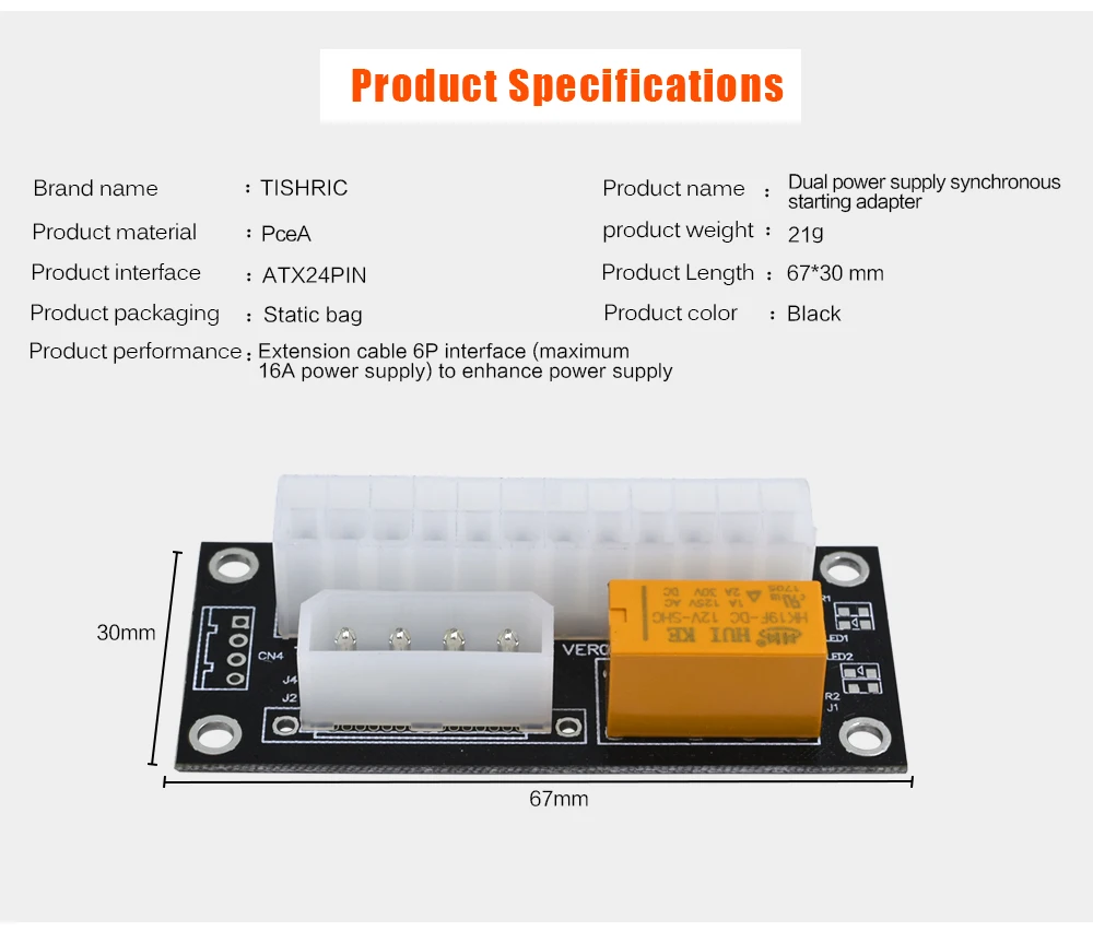 Adaptador de sincronización de fuente de alimentación Dual PSU TISHRIC ADD2PSU ATX 24Pin a 4pin/SATA Molex Extender Cable Riser Card para tarjeta gráfica