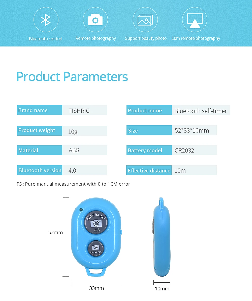 Comprar TISHRIC-botón de Control remoto Bluetooth para iOs, temporizador automático, controlador inalámbrico, botón de cámara, soporte para teléfonos Android de Apple