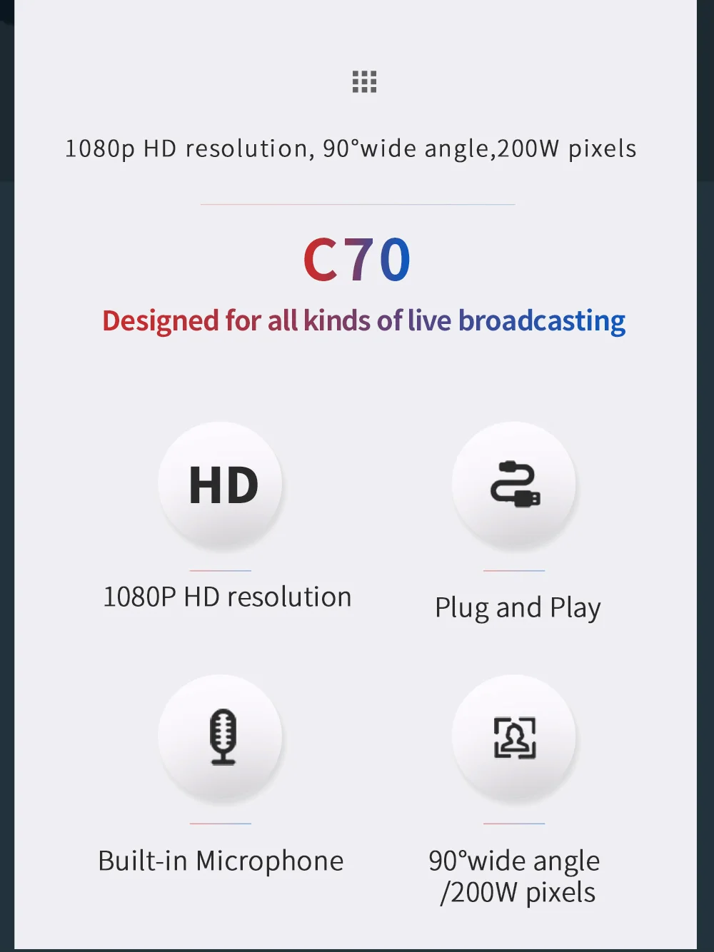 2: Resolución HD 1080P, gran angular de 90 °, píxeles de 200W, C70 diseñado para todo tipo de transmisiones en vivo