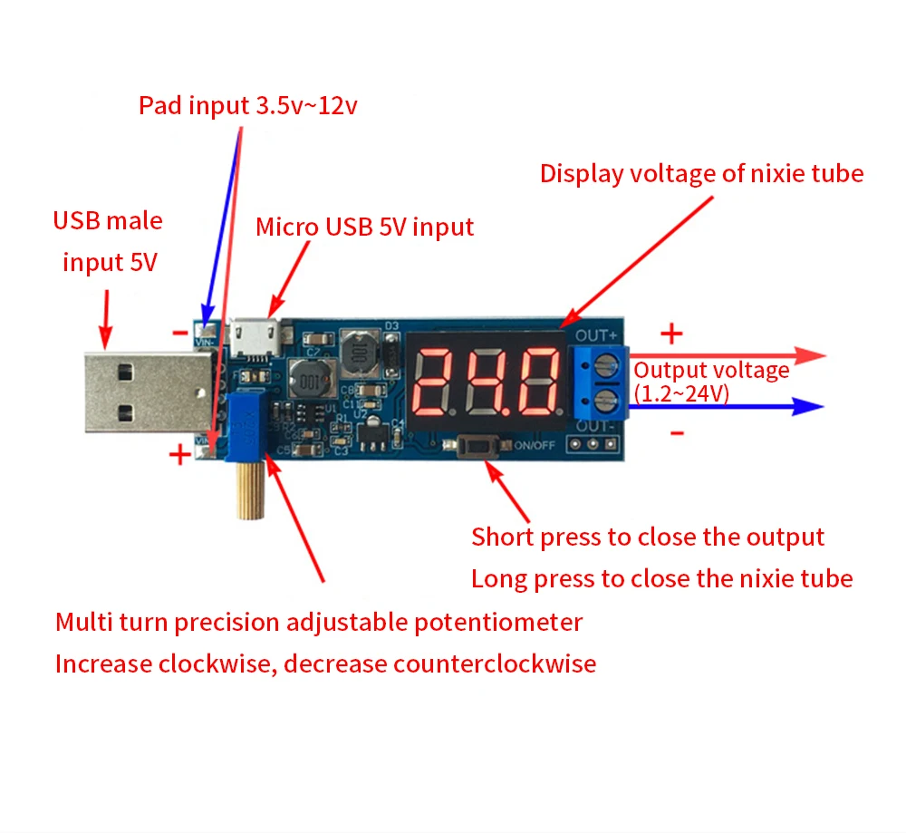 TISHRIC Boost Buck Converter USB Step Up/Down USB DC 5V a 3,3 V/12V USB Boost Módulo de fuente de alimentación Salida ajustable DC 1,2 V-24V