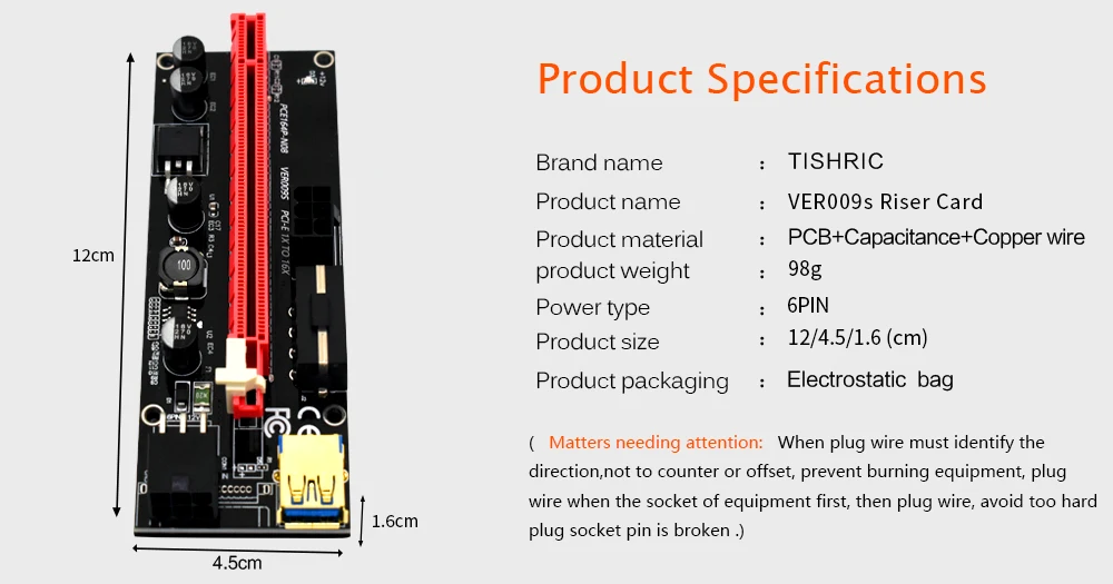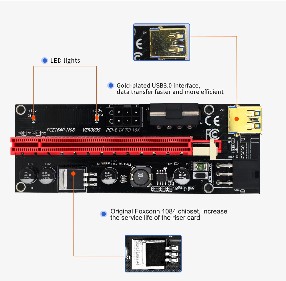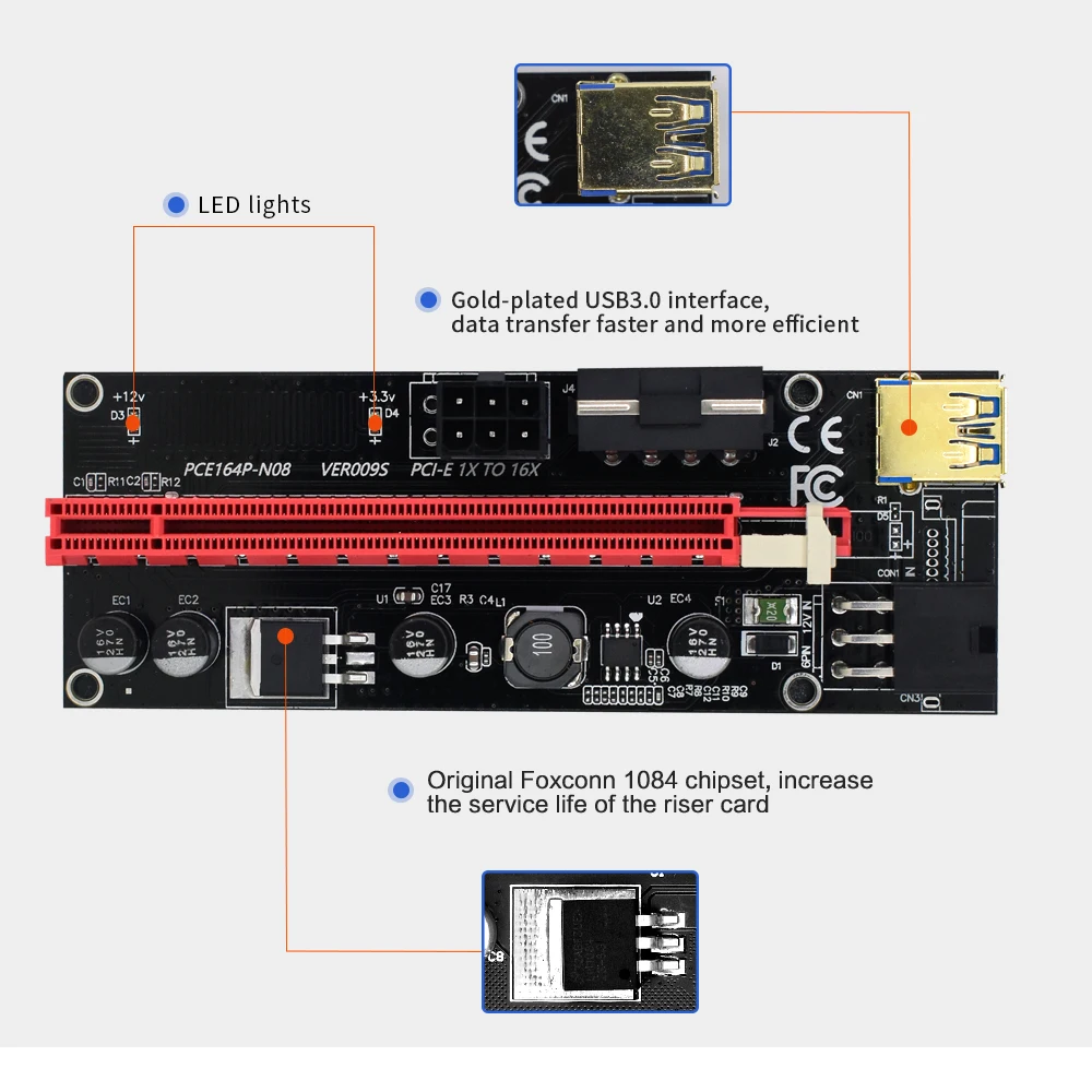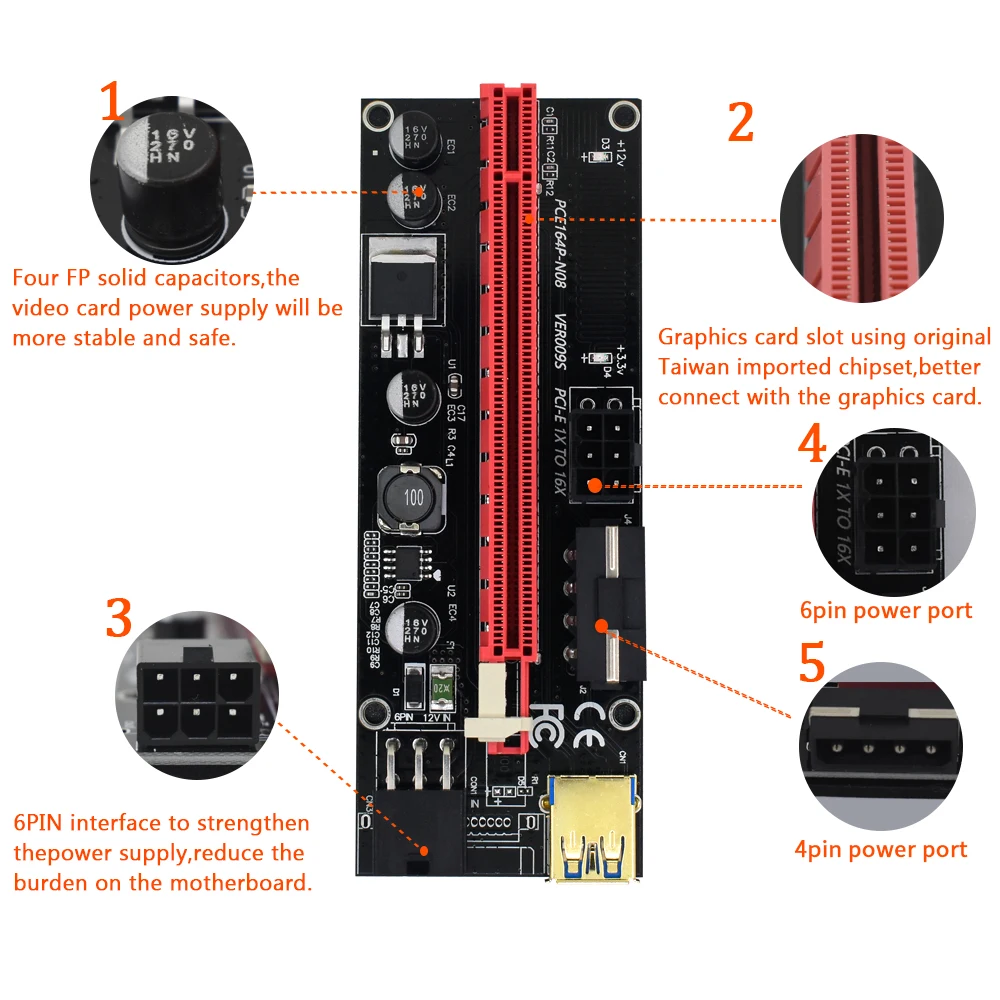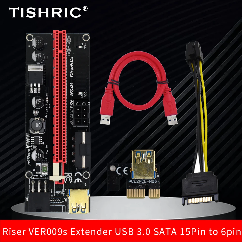 TISHRIC PCIE Riser 009s VER009s Riser PCI Express X16 Extender USB 3,0 a 6pin Adaptador Tarjeta de video Riser Card para minería BTC