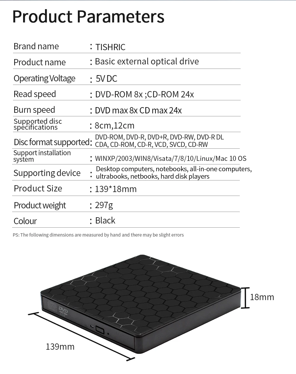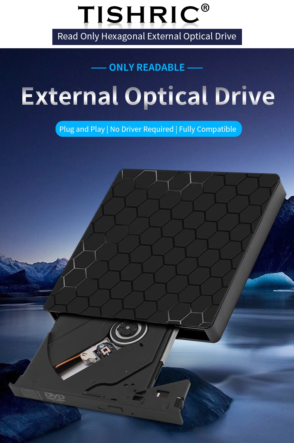 Unidad óptica externa básica TISHRIC, interfaz USB 3,0 tipo C, solo lector de disco, Unidad de CD y DVD de ROM de 2 pulgadas para portátil