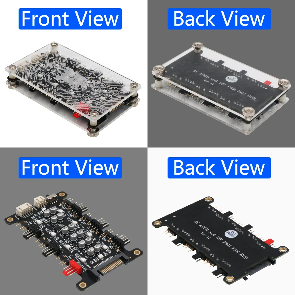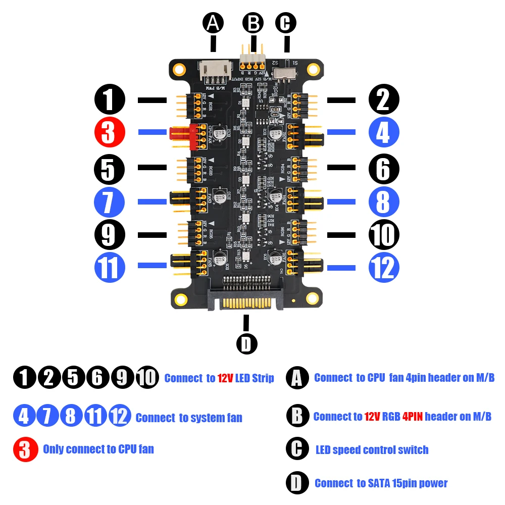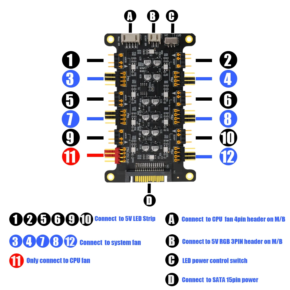 4.Expanda las interfaces de ventilador de 4 pines para resolver el problema de la falta de interfaces de ventilador de la placa base. Diseñado para ventiladores de 12V 4 pines 3 pines, admite arranque simultáneo en la mayoría de los ventiladores de 10 canales.