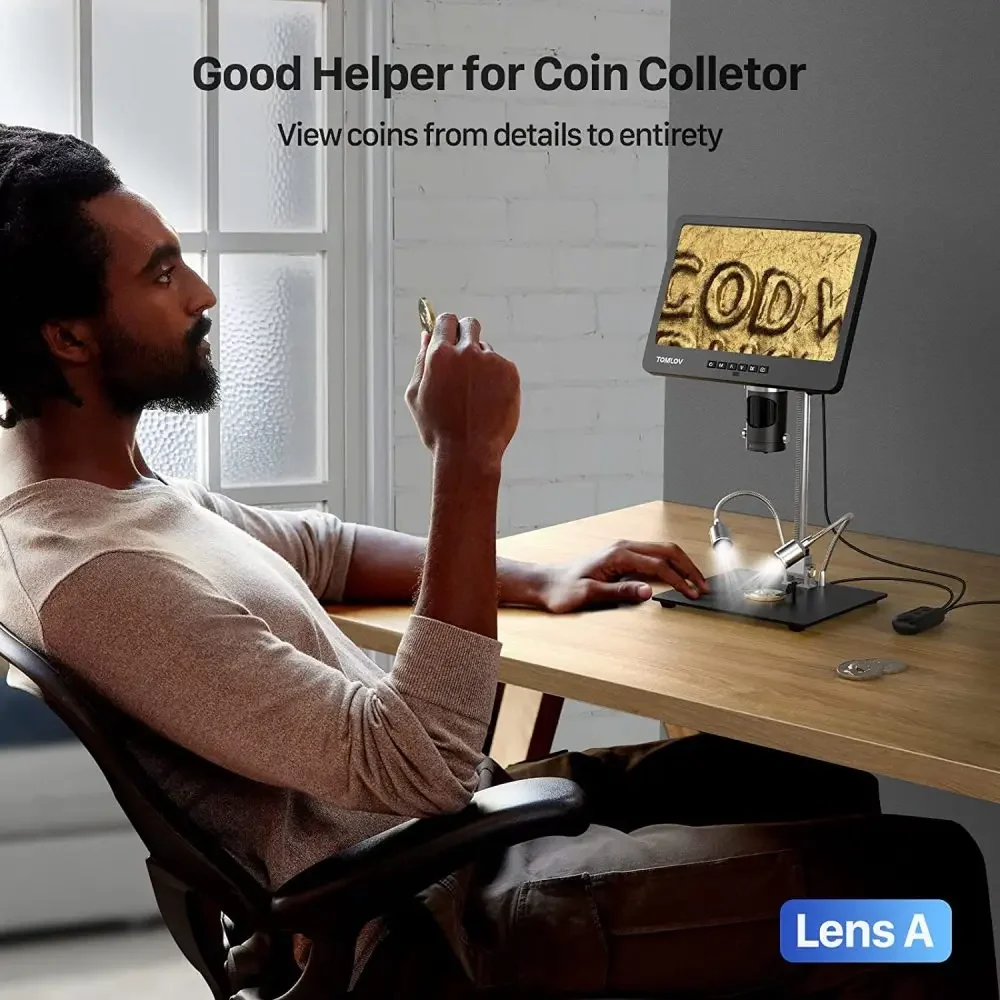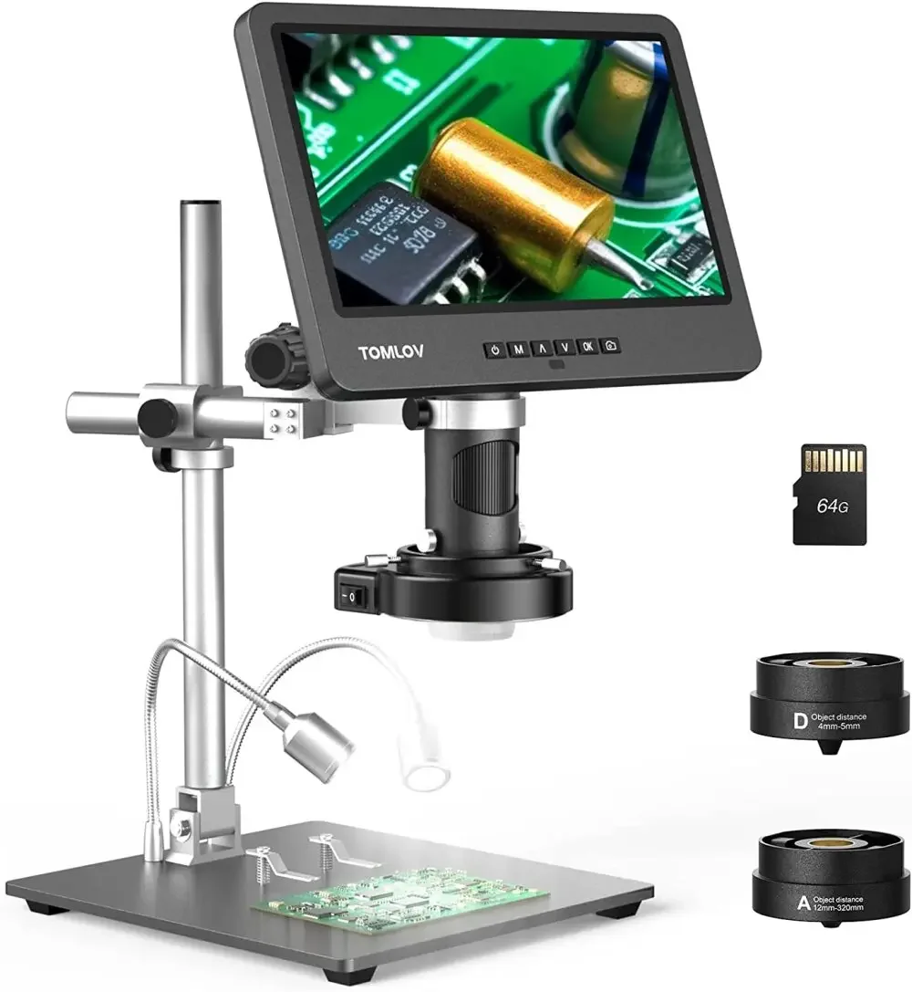 TOMLOV-Microscopio digital DM602 Pro, 10,1 pulgadas, HDMI, 2000X, soporte de pluma profesional mejorado, microscopio de soldadura LCD con 3 lentes, microscopio de monedas con anillo de luz, microscopio de portaobjetos biológico, compatible con PC