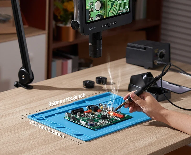 【Alfombrilla de soldadura de silicona resistente al calorOpcional】Esta estera de soldadura de silicona resistente al calor. Proteja su superficie de trabajo de temperaturas de hasta 932 ° F (500 ° C). La gran alfombrilla de 13,8 ''* 9,8'' ofrece un amplio espacio y presenta un diseño funcional con una regla de escala, cajas de piezas, áreas magnéticas, posiciones de tornillos y más. Mejora la precisión y la Organización con este innovador accesorio. Eleve su juego de soldadura con el DM602 Flex.