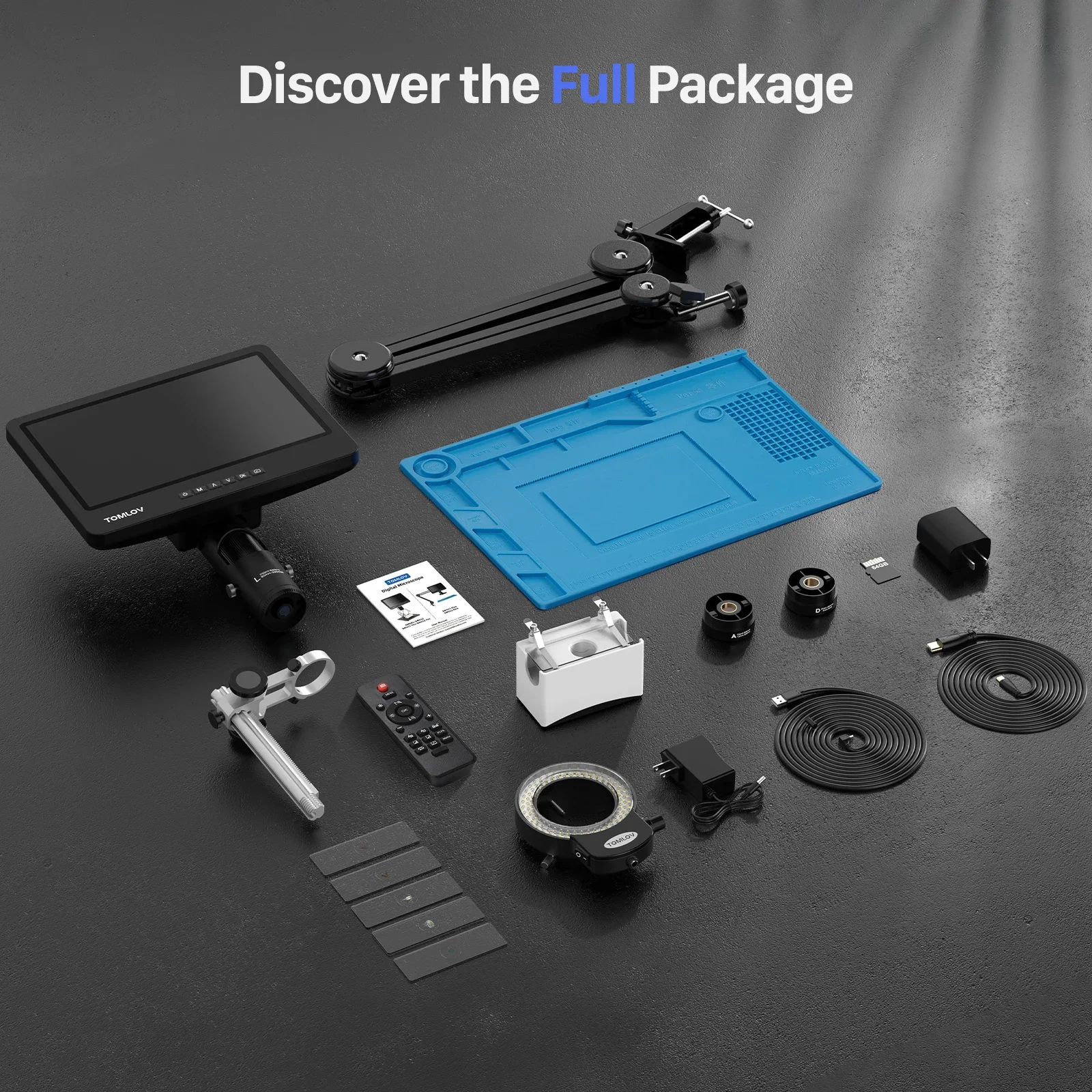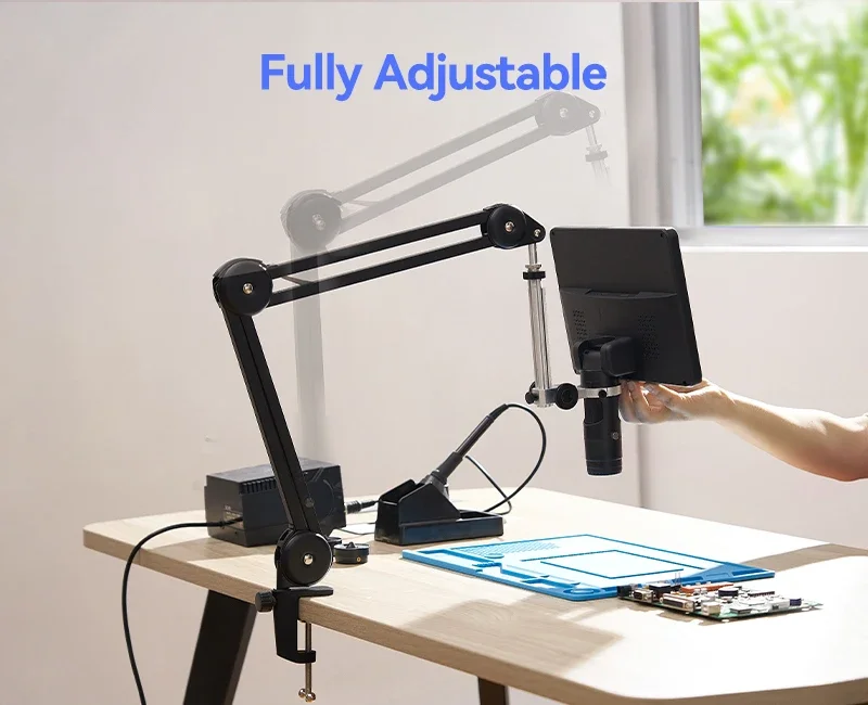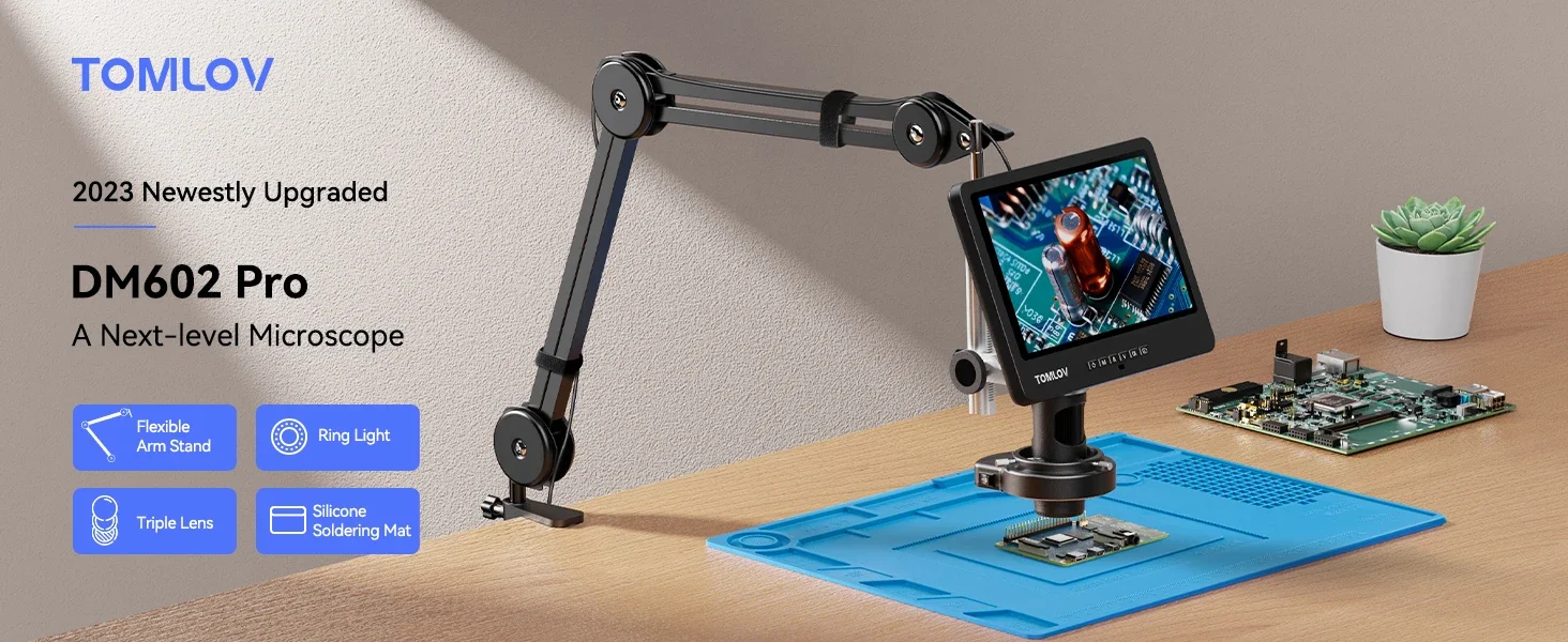 TOMLOV DM602 Microscopio de soldadura digital flexible 2000x64GB, brazo flexible, de 10,1 HDMI Microscopio "con 3 lentes, Microscopio de monedas con luz de anillo, Microscopio de video LCD para adultos, Estera de reparación electrónica opcional【Posicionamiento flexible con brazo ajustable】Equipado con un brazo versátil, el microscopio digital Tomlov DM602 Flex ofrece una capacidad de ajuste completa. Cuenta con una rotación de base de 360 ° para una extensión horizontal de 135 ° y un eje de brazo de 180 ° para un movimiento vertical de observación para un posicionamiento preciso. Con su diseño plegable, se puede almacenar cómodamente para ahorrar espacio y sacar fácilmente para su uso inmediato. Experimenta la facilidad y la postura mejorada mientras sueldas