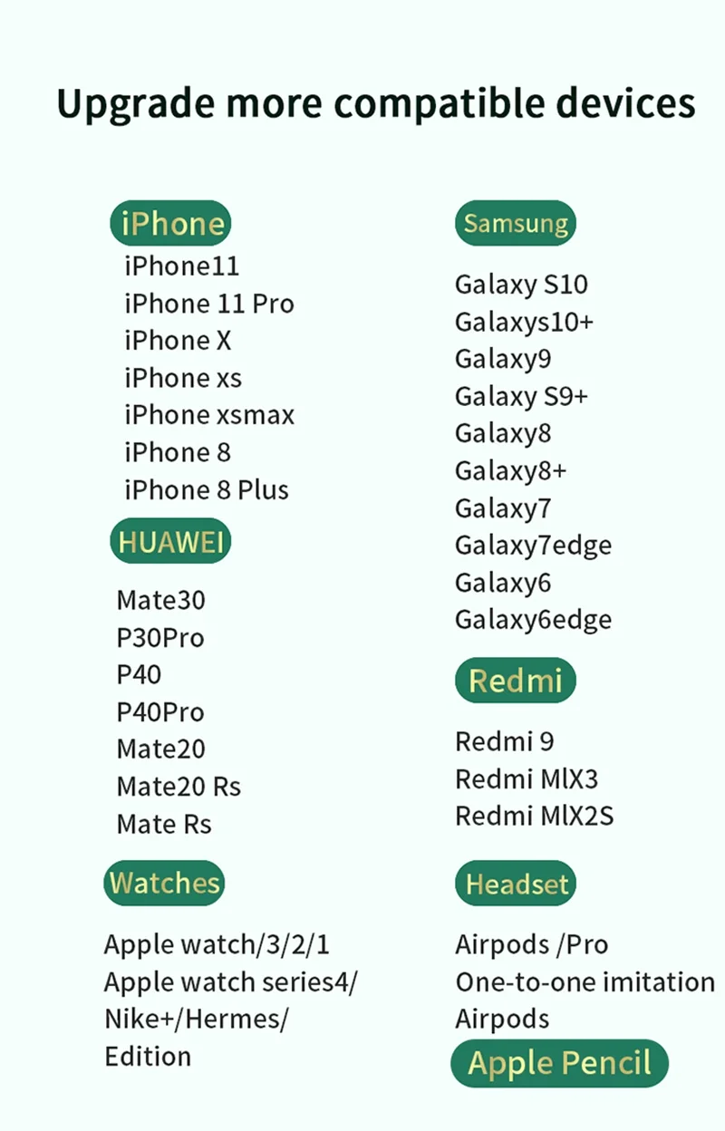 Nuestra carga puede cargar Iphone 8 8P x XS XR XS Max, Samsung S10 S10 + S9 S9P S8 S8P S7 S7 Edge,Huawei mate 20 Pro, Huawei p30 Pro, y cualquier otro dispositivo admite carga inalámbrica.