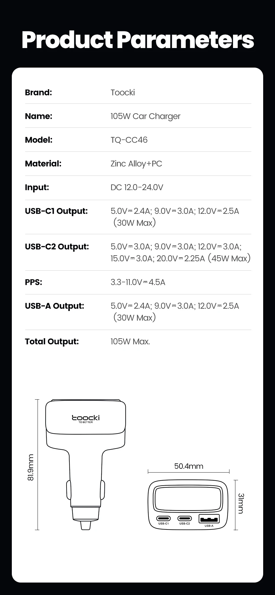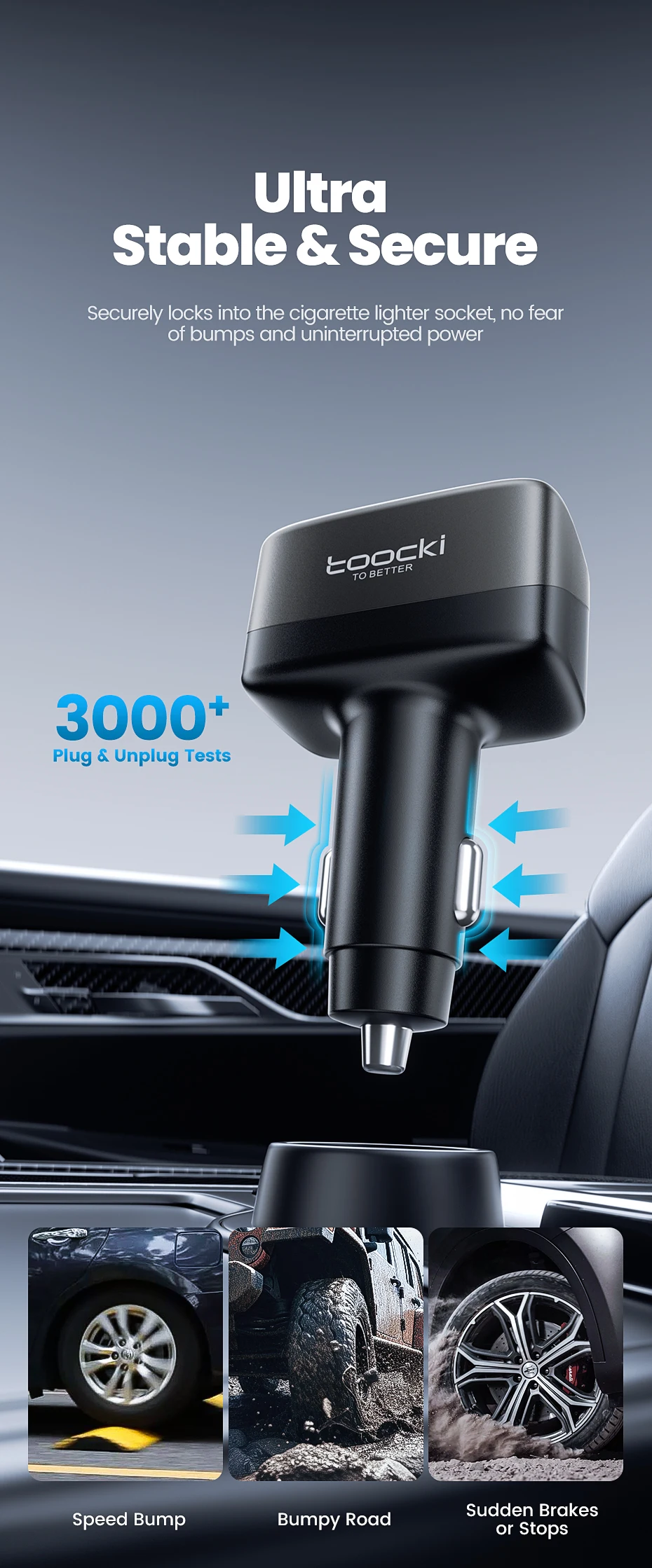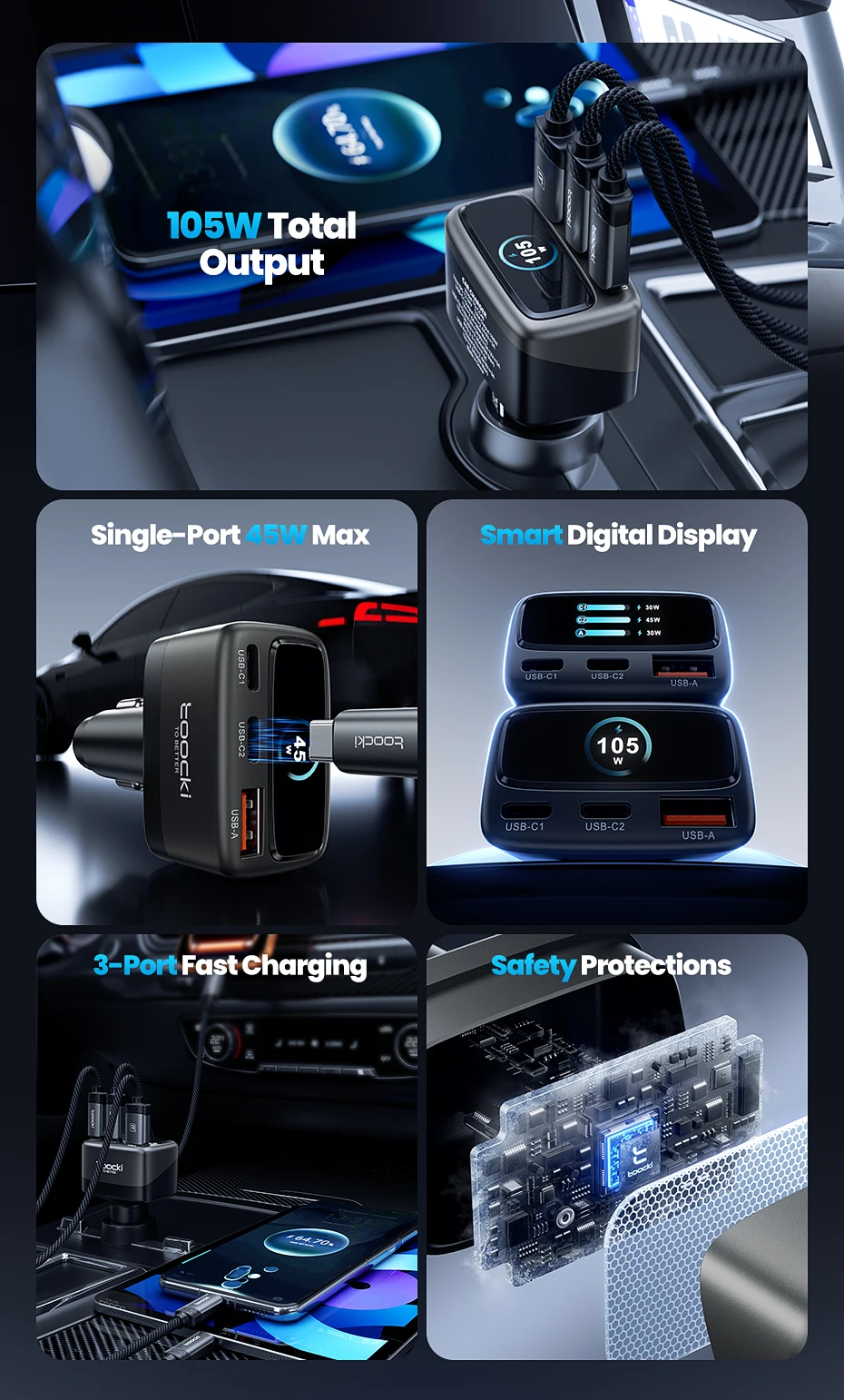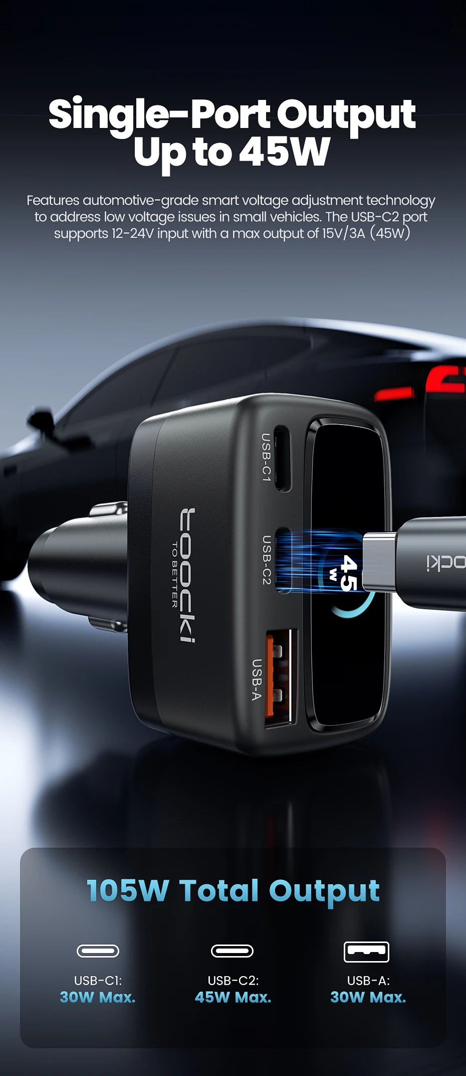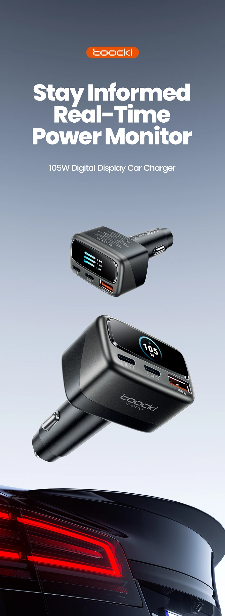 Cargador de automóvil con pantalla digital Toocki de 105 W, admite voltaje de 12 V ~ 24 V, compatible con la mayoría de los modelos de vehículos convencionales
