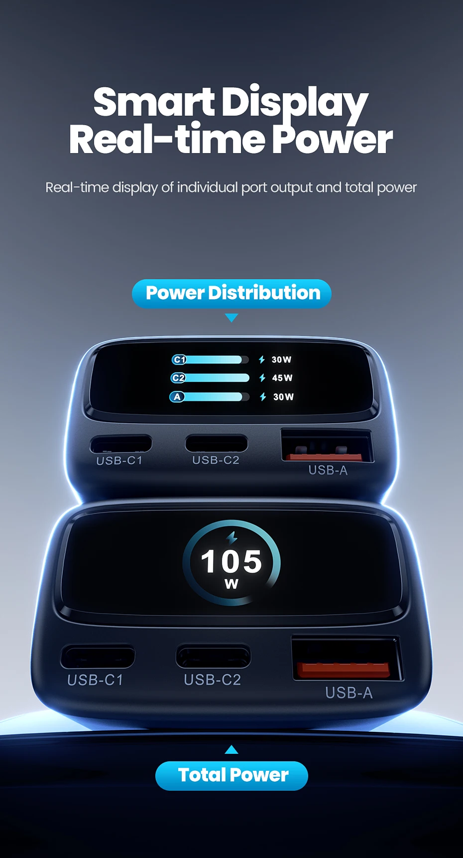 ✅Pantalla digital inteligente: visualización en tiempo real de la salida de puerto individual y la potencia total.
