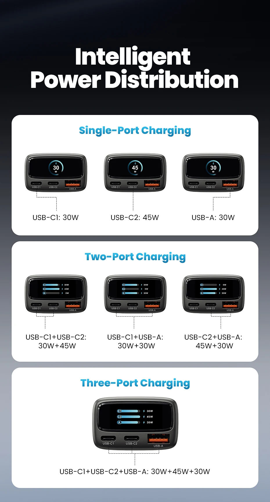 USB-C1+USB-C2+USB-A: 30W+45W+30W