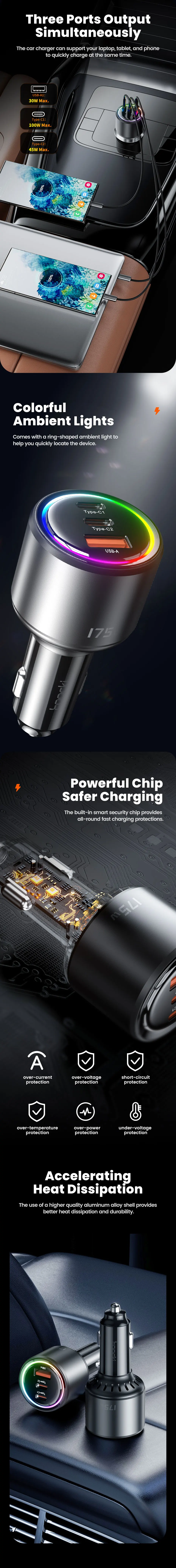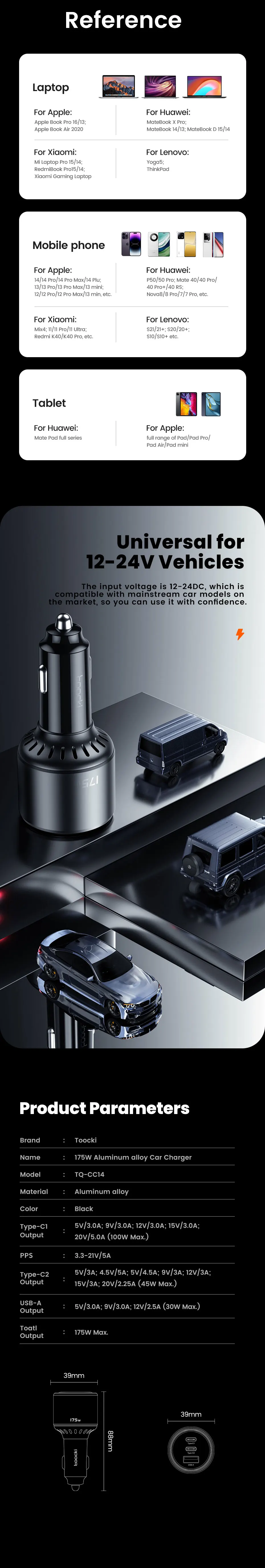 Comprar Toocki 175W cargador USB de coche carga rápida PD QC3.0 PPS tipo C cargador de teléfono de coche para iPhone 15 14 Pro Max Xiaomi Samsung S23 S24