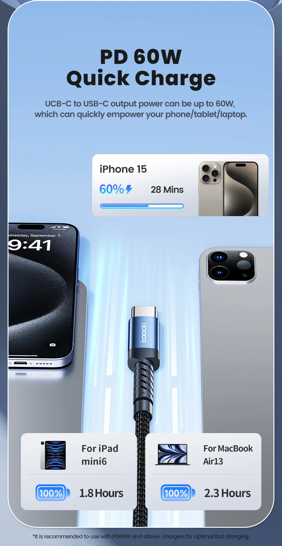 Quick Charge]UCB-C to USB-C output power can be up to 60W, which can quickly empower your phone/tablet/laptop.